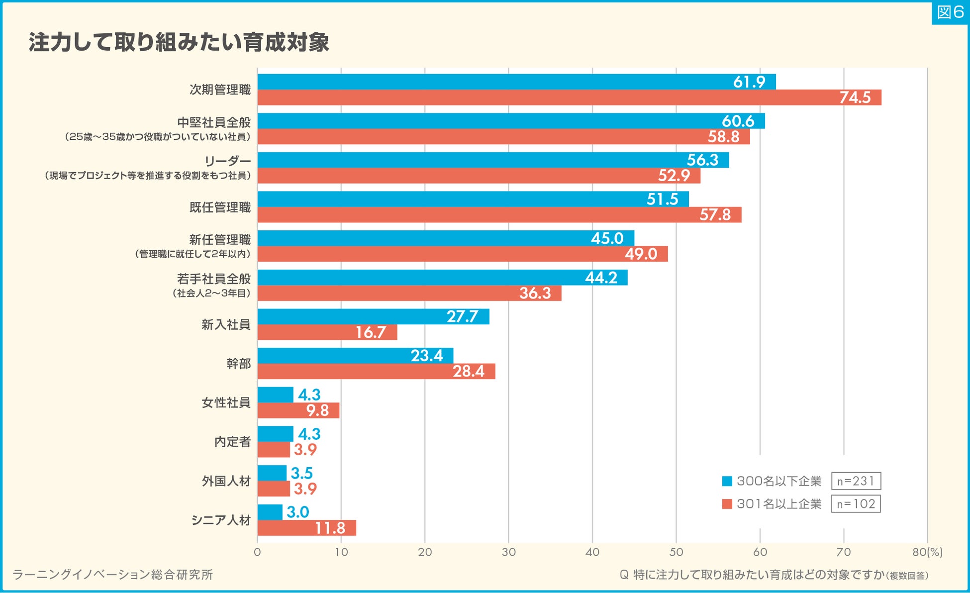 300名以下企業では、「次期管理職」が61.9%と最も高く、次に「中堅社員全般(25歳~35歳かつ役職がついていない社員)」が60.6%、「リーダー(現場でプロジェクト等を推進する役割をもつ社員)」が56.3%と続きました。