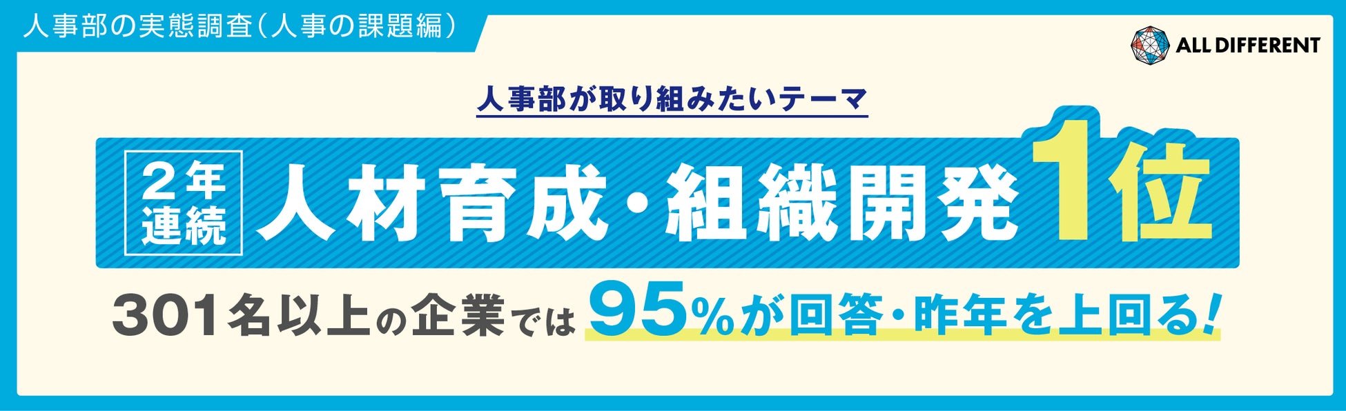 本調査結果より、人事部の取り組みたいテーマは2年連続「人材育成・組織開発」がトップとなりました。特に301名以上の大企業では9割以上の人事部が「人材育成・組織開発」を取り組みたいテーマと回答しており、300名以下の中小企業よりも課題として認識している企業の割合が高いことが明らかになりました。