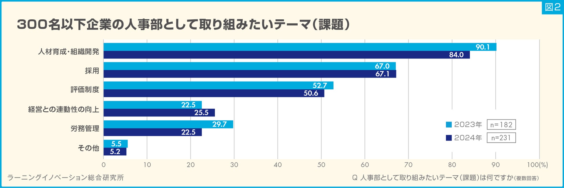 次に、同様の質問を昨年の結果と比較しました。300名以下企業では、順位は変わらないものの「人材育成・組織開発」の割合は昨年の90.1%から6.1ポイント、「労務管理」は29.7%から7.2ポイント減少し、「経営との連動性の向上」の割合は22.5%から3.0ポイント上昇する結果となりました。(図2)