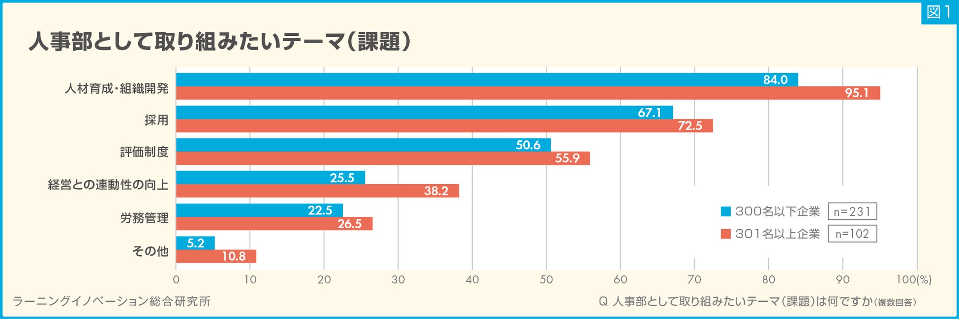 1. 人事部として取り組みたいテーマ「人材育成・組織開発」が2年連続トップ。301名以上の企業では9割超と昨年より割合高まる