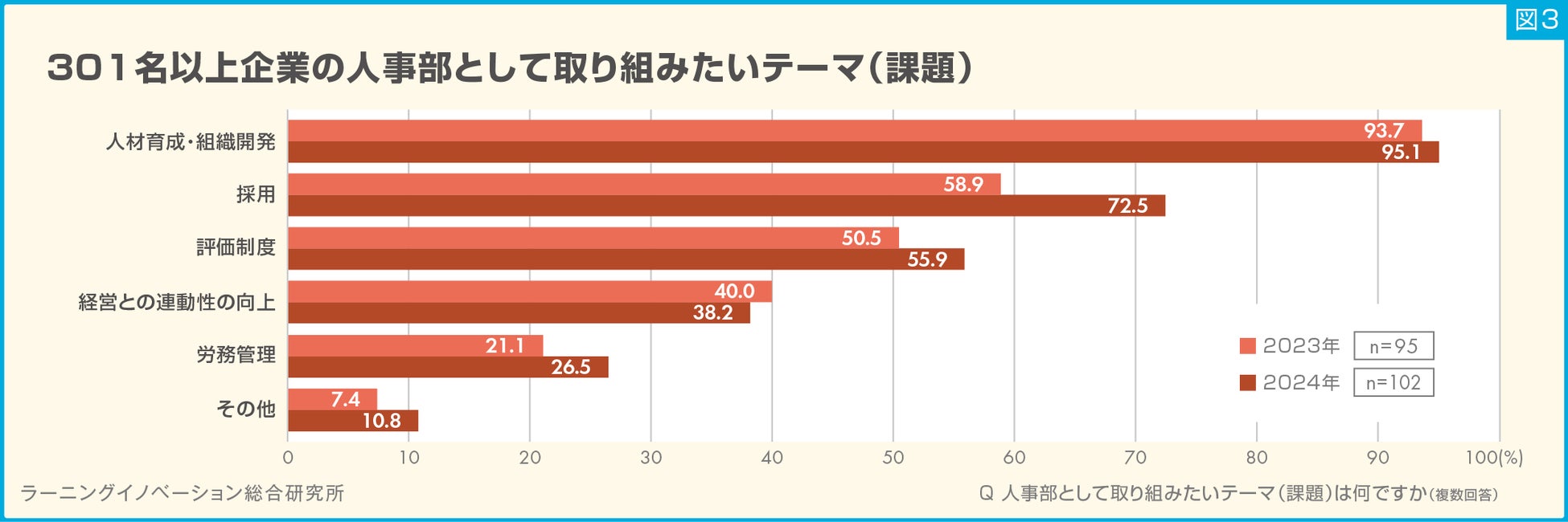 一方、301名以上企業では、「人材育成・組織開発」と回答した割合が、昨年の93.7%から1.4ポイント上昇する結果となりました。「採用」も13.6ポイント上昇し、最大の伸び率となりました。301名以上の大企業では、「人材育成・組織開発」や「採用」に関する取り組みを重視する割合が、昨年よりも高まっている傾向が見受けられました。(図3)