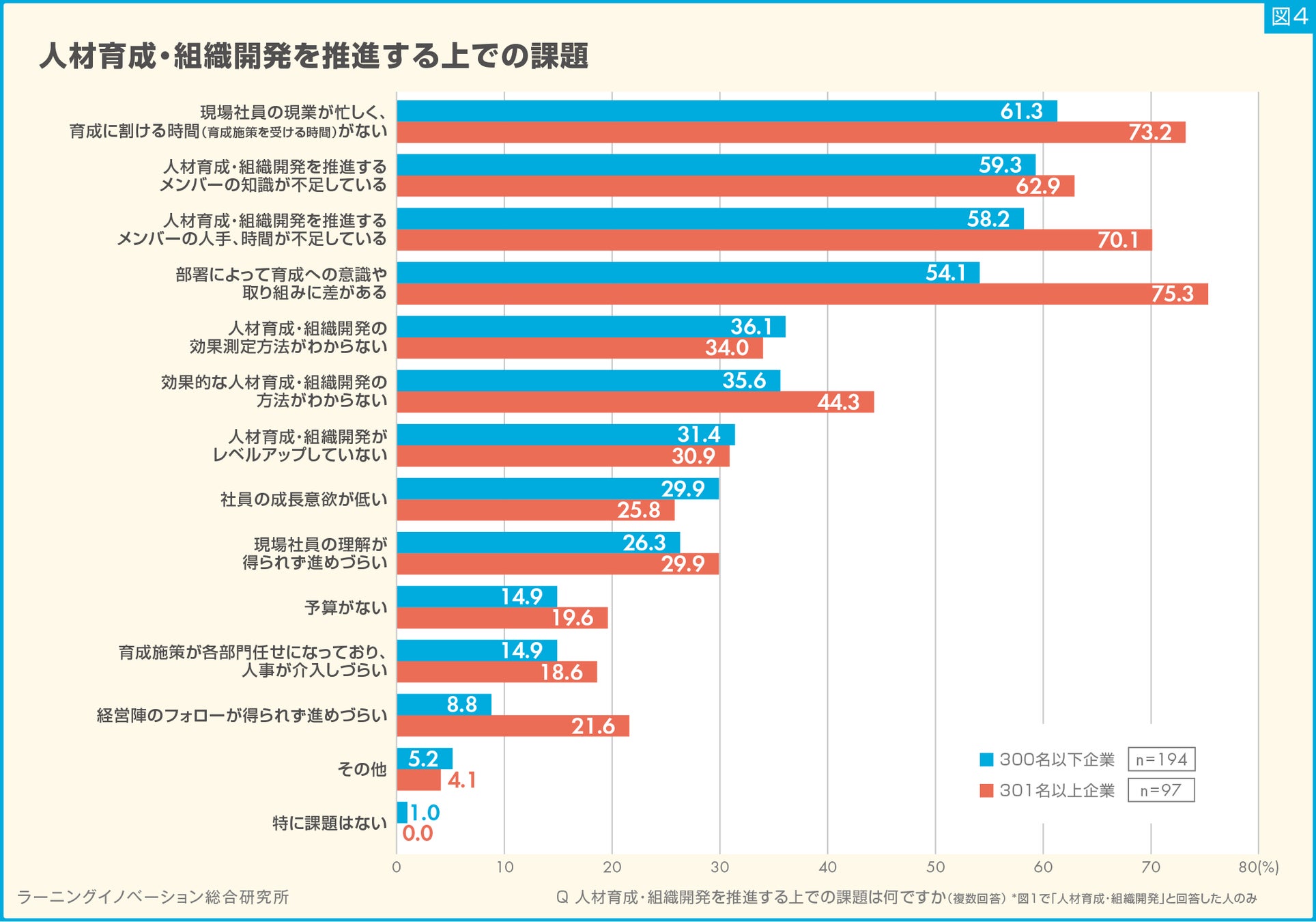 人材育成・組織開発を推進する上での課題、300名以下企業は「現場社員の育成に割ける時間がない」、301名以上企業は「部署による意識・取り組みの差」がトップの回答に