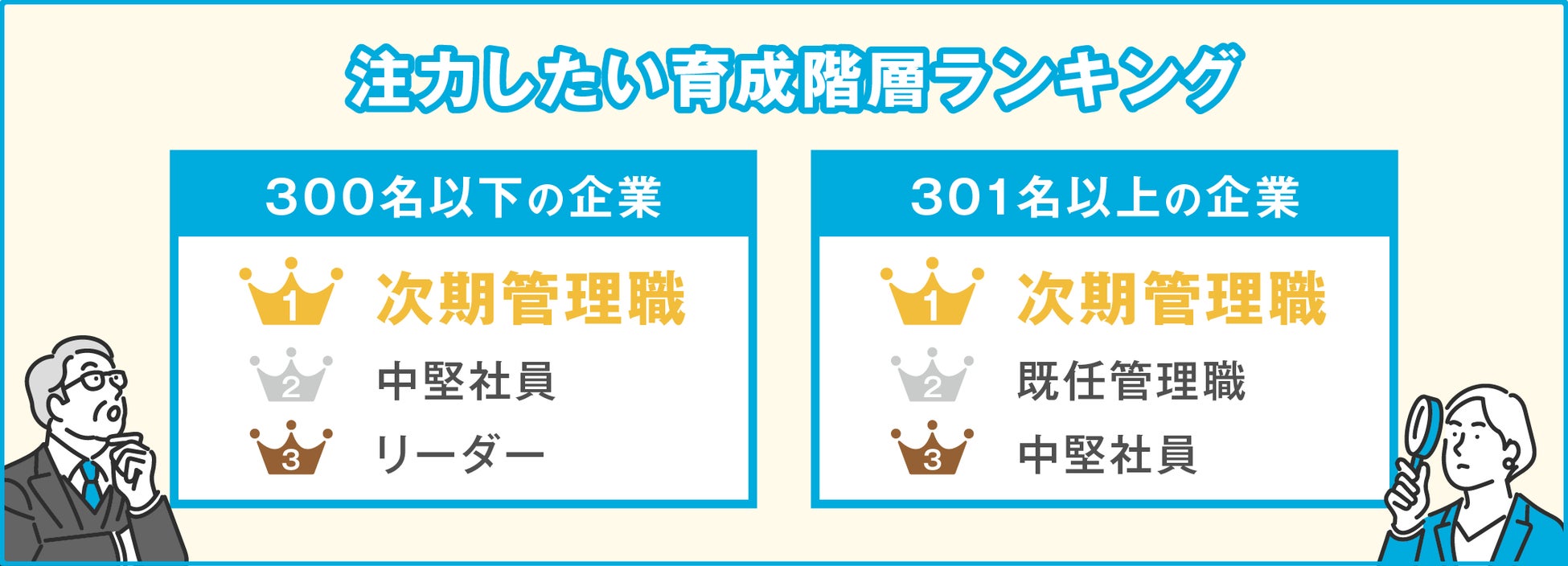 最も注力して取り組みたい育成階層は「次期管理職」。301名以上の企業は7割を超える結果に