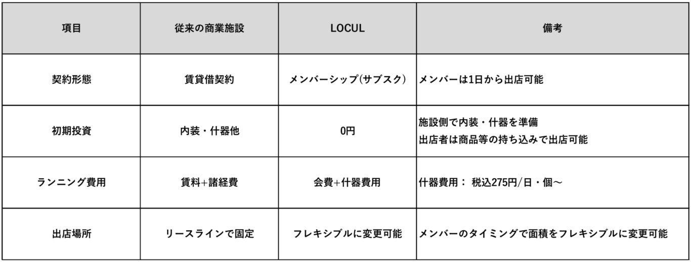 従来の商業施設は、初期投資や契約期間など出店へのハードルが高いことから、常に変化するトレンドや消費者ニーズへの対応に課題がありました。その課題に対して、LOCULでは施設側で内装や什器を用意することで初期投資を限りなく抑えることを可能としています。また、期間や場所、什器を自由にセレクトし、ミニマム1日1㎡から出店できるサブスクリプションサービスを提供します。サブスクメンバーは月額会費制で、自身の出店したいタイミングで什器費用を都度支払うことで、賃料負担なく出店が可能になります。このようなフレキシブルな出店スタイルの仕組みを構築し、様々な業種業態の企業や個人がチャレンジできる場所を提供することで、多種多様な個性や文化が成長・発展していく施設をめざします。