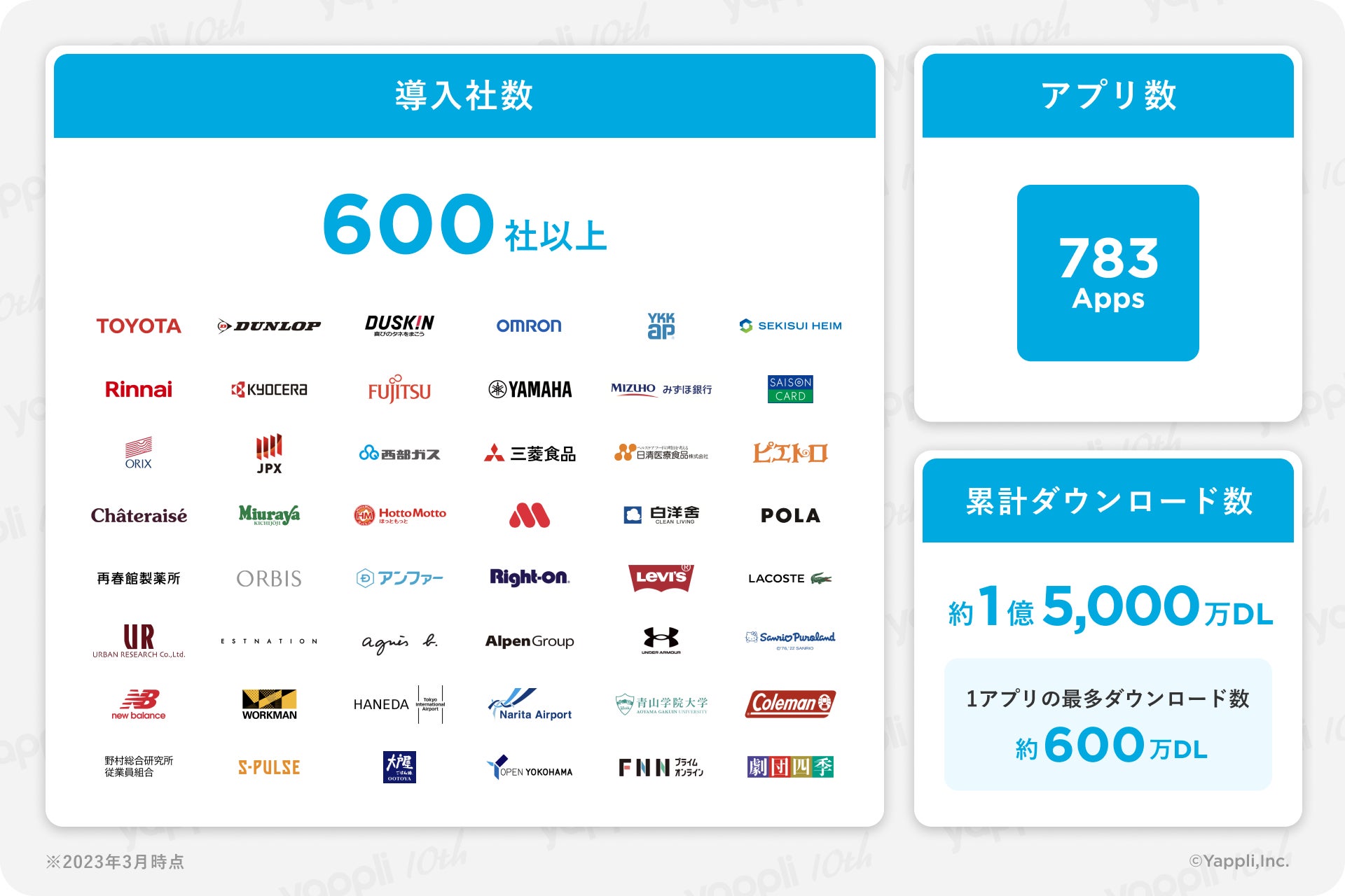 その後10年間で導入企業は600社以上、Yappliで作られたアプリ数は783を超え、累計ダウンロード数は約1.5億回と、多くの企業・団体のモバイルDXを支えるサービスに成長しました。