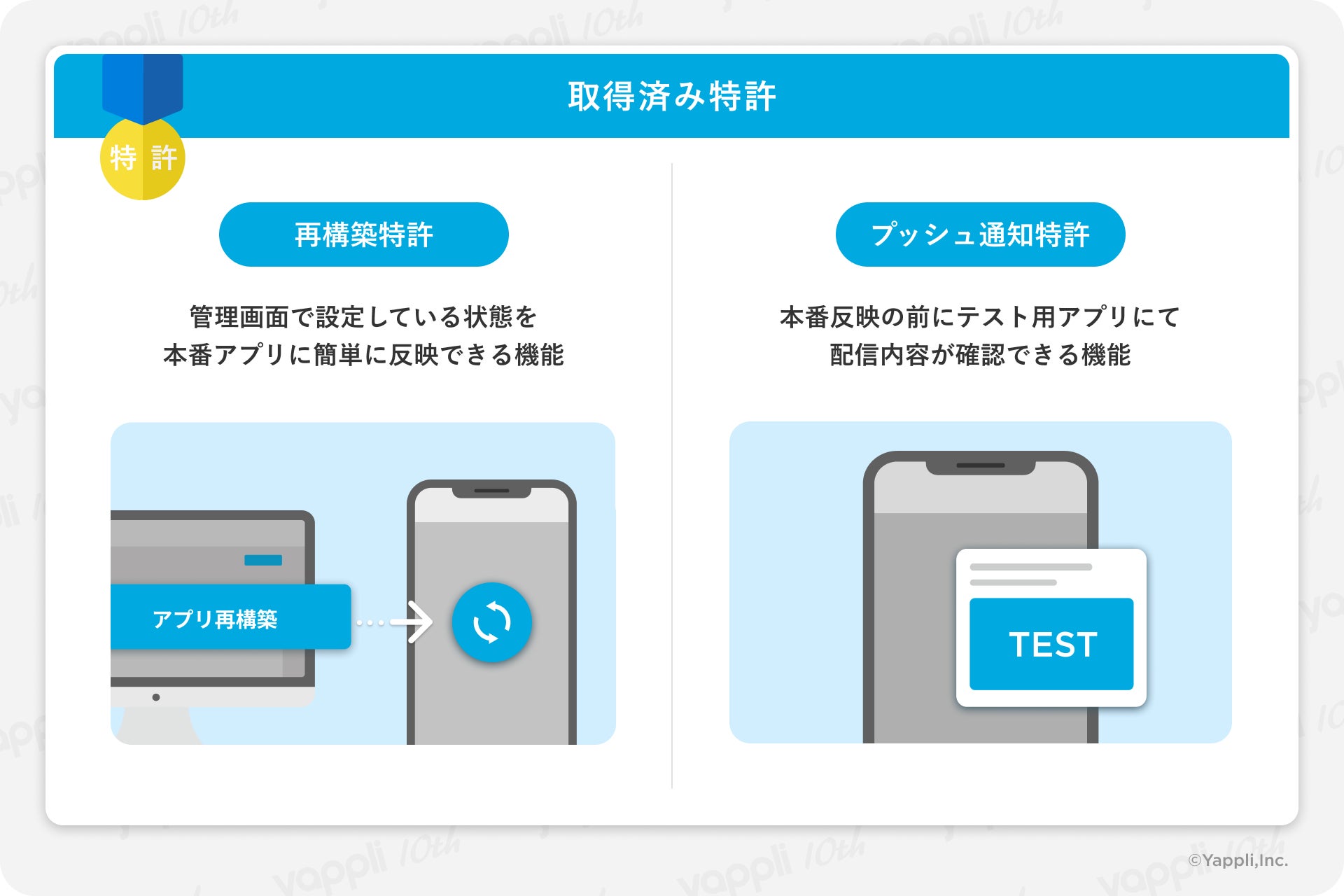 また、Yappli独自の技術として特許も取得しております。管理画面で設定した状態を本番アプリに簡単に反映できる「再構築特許」、アプリ上でプッシュ通知を送信する際に事前にテスト用アプリで配信内容が確認できる「プッシュ通知特許」を備えています。