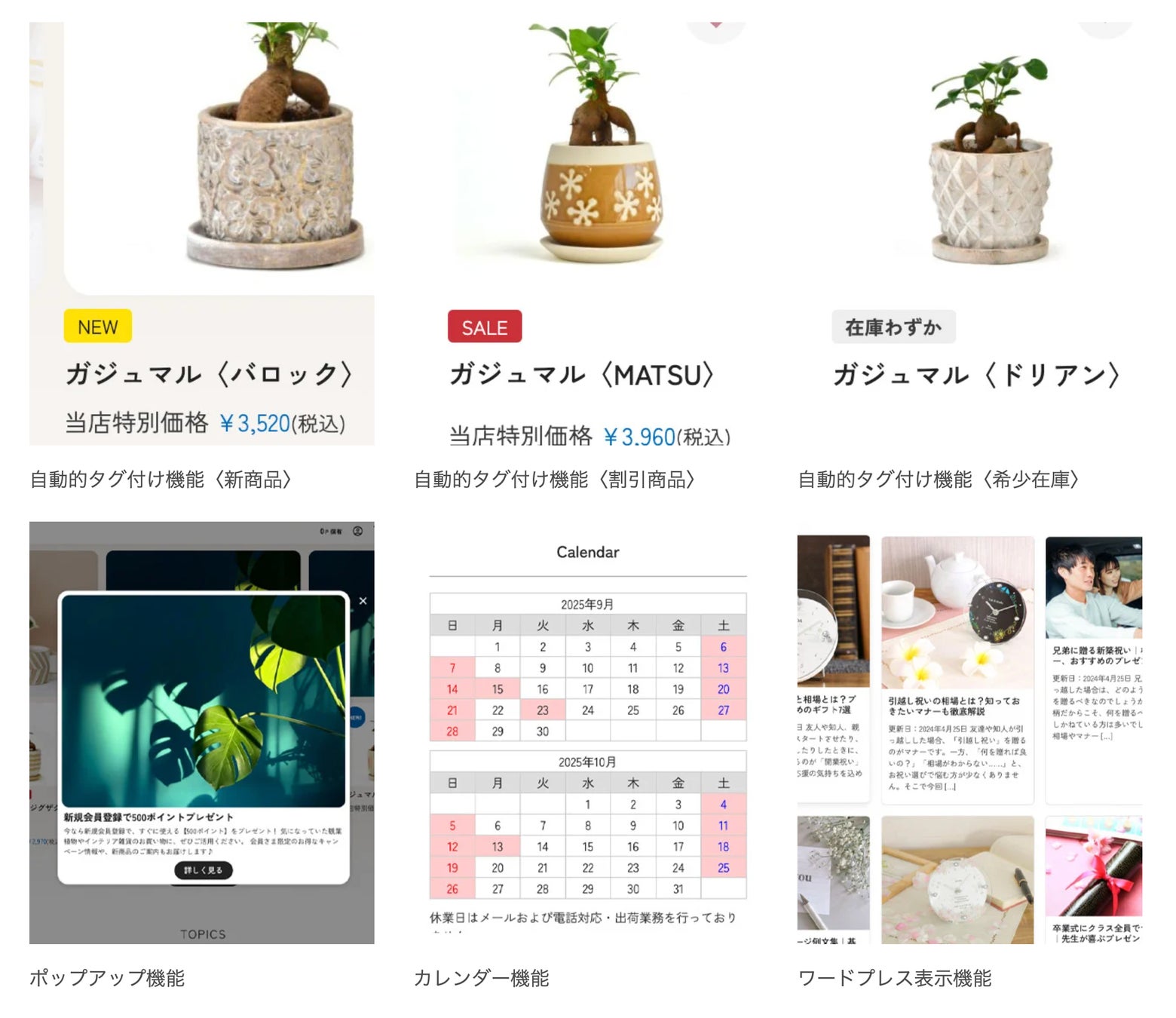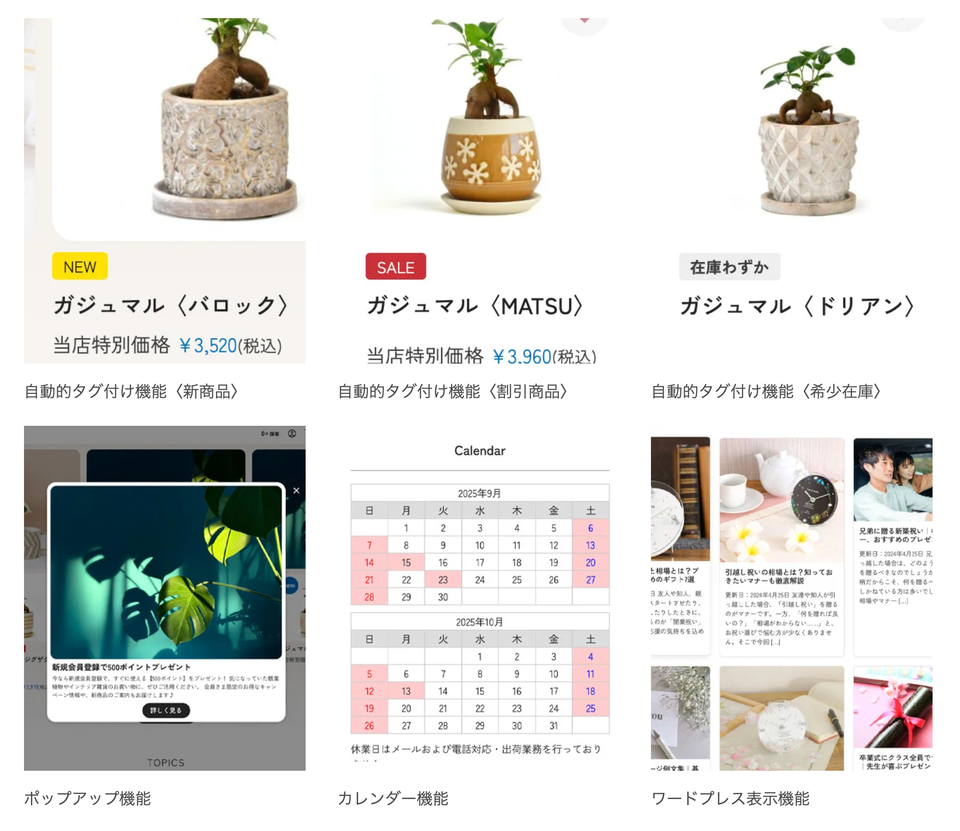 「NEW」「在庫わずか」などのタグ付与、ポップアップ表示、カート導線改善、海外ユーザー対応など、売上向上と運営効率化の両面に役立つ21の機能をひとつのサービスの中で利用できます。複数ツールの導入や管理の手間を減らしながら、ECサイト運営に必要な機能を活用することが可能になります。