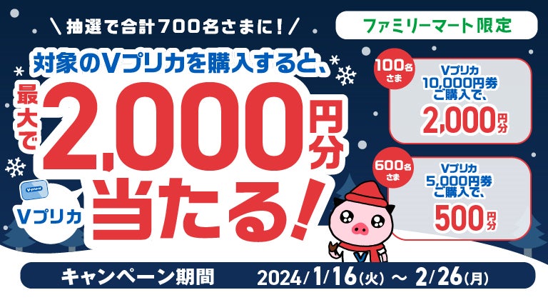 【ファミリーマート限定】抽選で合計700名さまに!Vプリカ購入で最大2,000円分のVプリカが当たる!