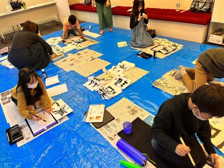 ・小学生たちが社員である先生たちと書き初めを行っている様子