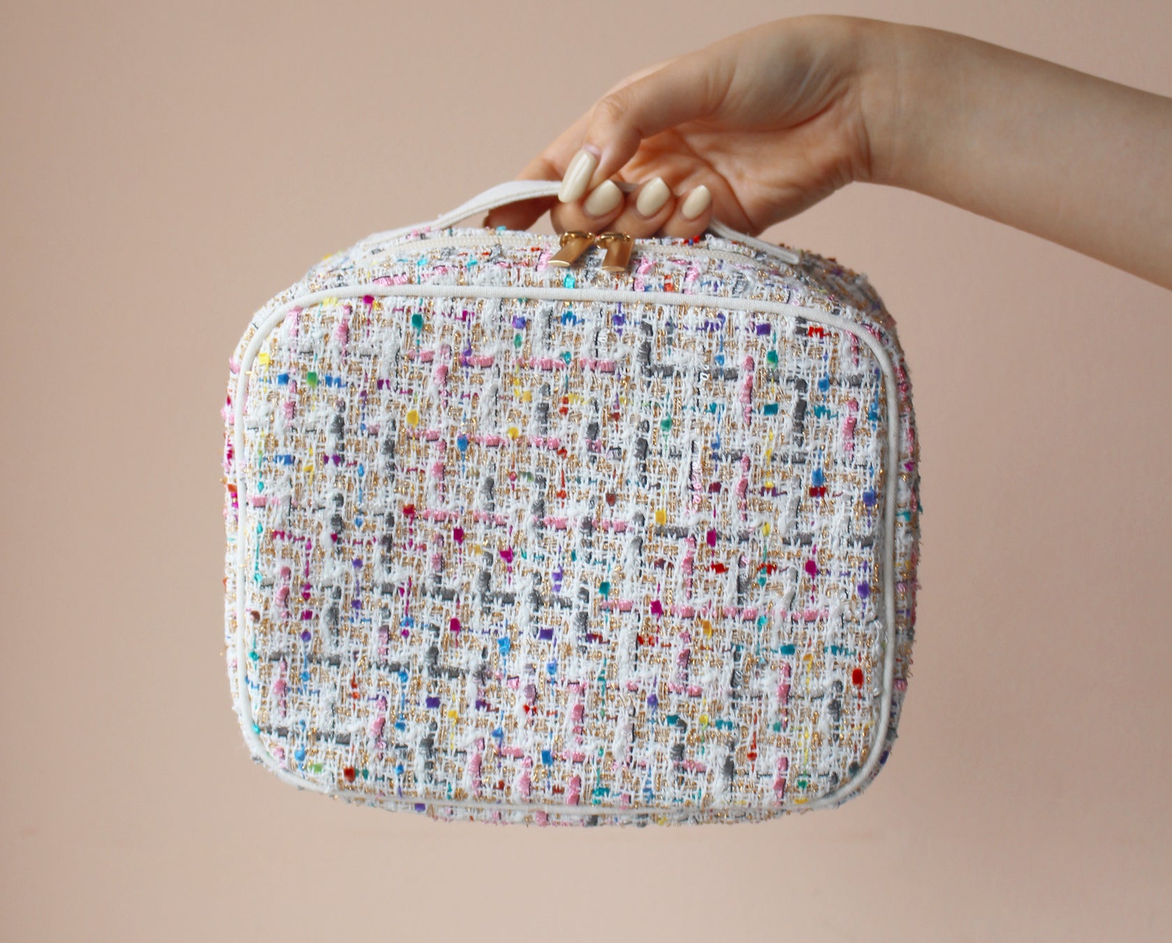 秋冬に定番のツイード素材は、誰もが一度は憧れるフレンチメゾンのジャケットがインスピレーション。女性らしい洗練されたデザインは、お部屋に置いておくだけで、気持ちが華やぎます。内側はポケット付きで、コスメやランジェリー、ボディケアツールの整理など使い方はあなた次第。旅行バッグのオーガナイザーとしても大活躍します。