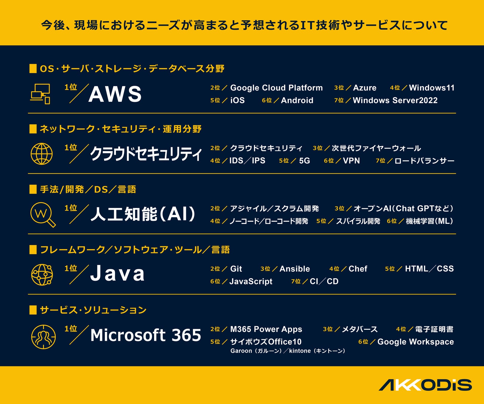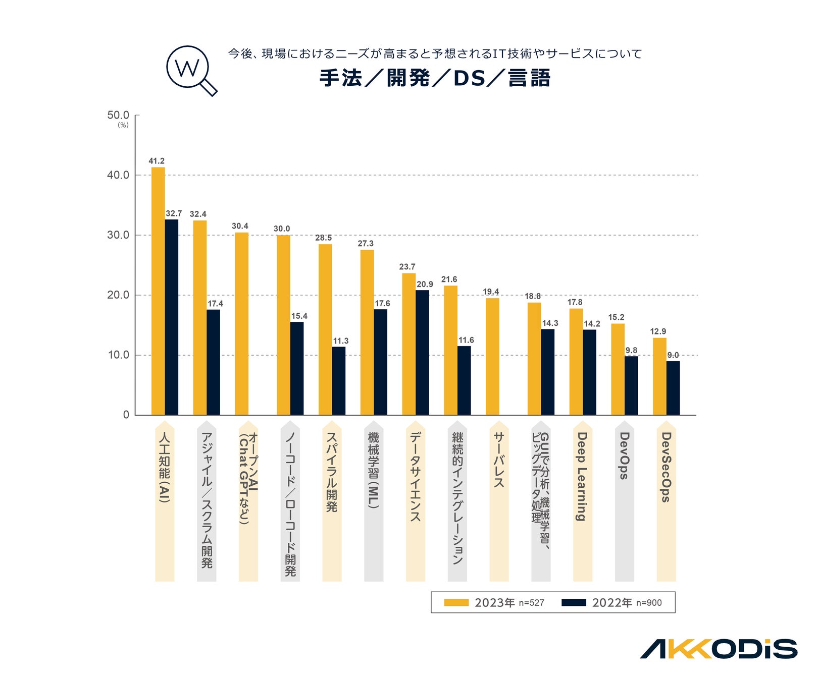 世界30ヵ国でデジタルとエンジニアリングを融合させたソリューションを提供するグローバルリーダーであるAKKODiSの日本法人で、企業および組織へエンドツーエンドのコンサルティングサービスを提供するAKKODiSコンサルティング株式会社(本社:東京都港区、代表取締役社長:川崎 健一郎、「以下、AKKODiS」)は、この度企業のエンジニア採用担当者527名を対象に「今後、現場においてニーズが高まると予想されるIT技術やサービス」について調査を実施いたしました。