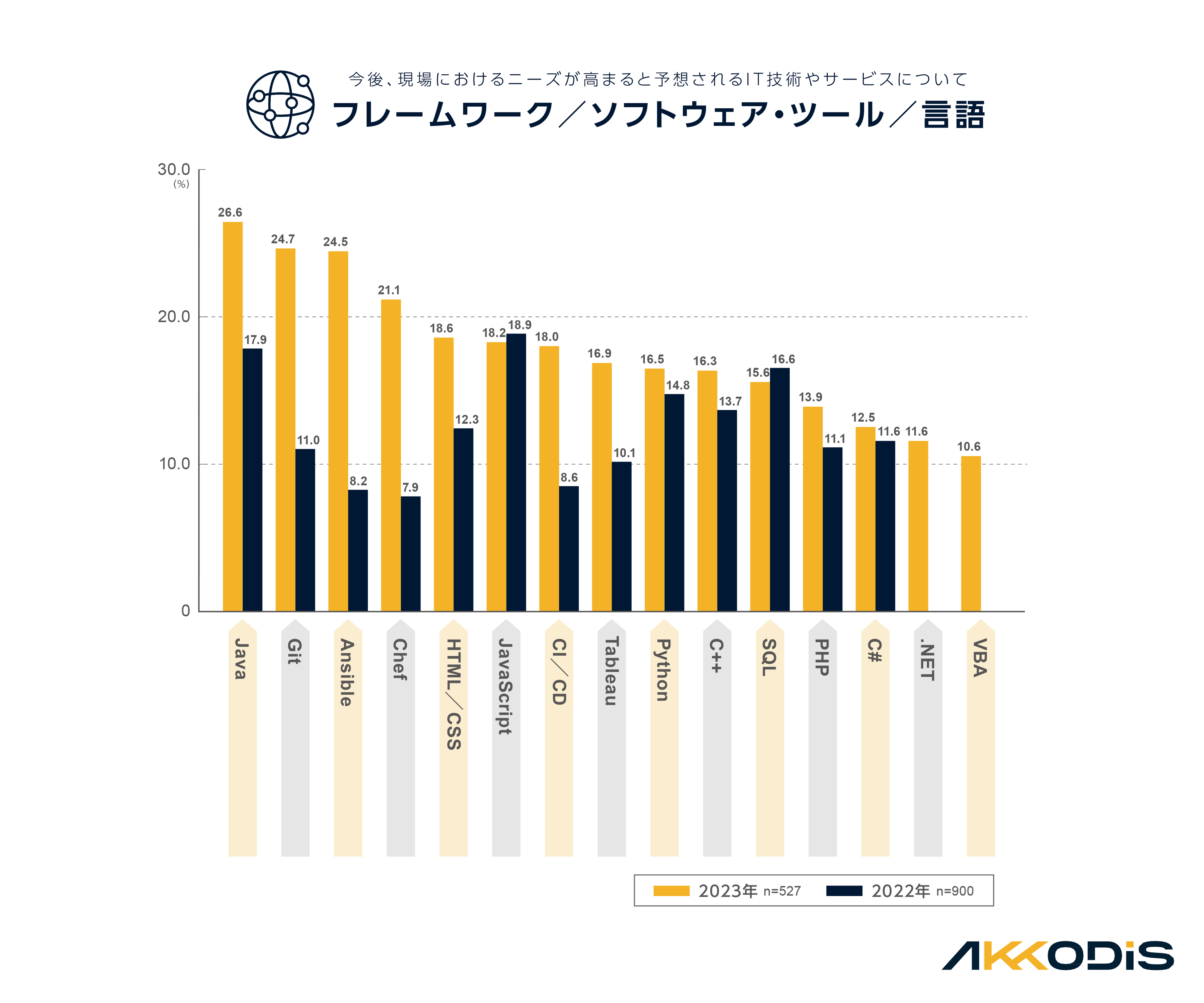 「フレームワーク/ソフトウェア・ツール/言語」の分野で、今後ニーズが高まると回答したものは、1位「Java」、2位「Git」、3位「Ansible」という結果になりました。こちらに関してもエンジニア不足を解消するため、IT機器の管理を効率化・自動化するツールが上位にランクインしています。
