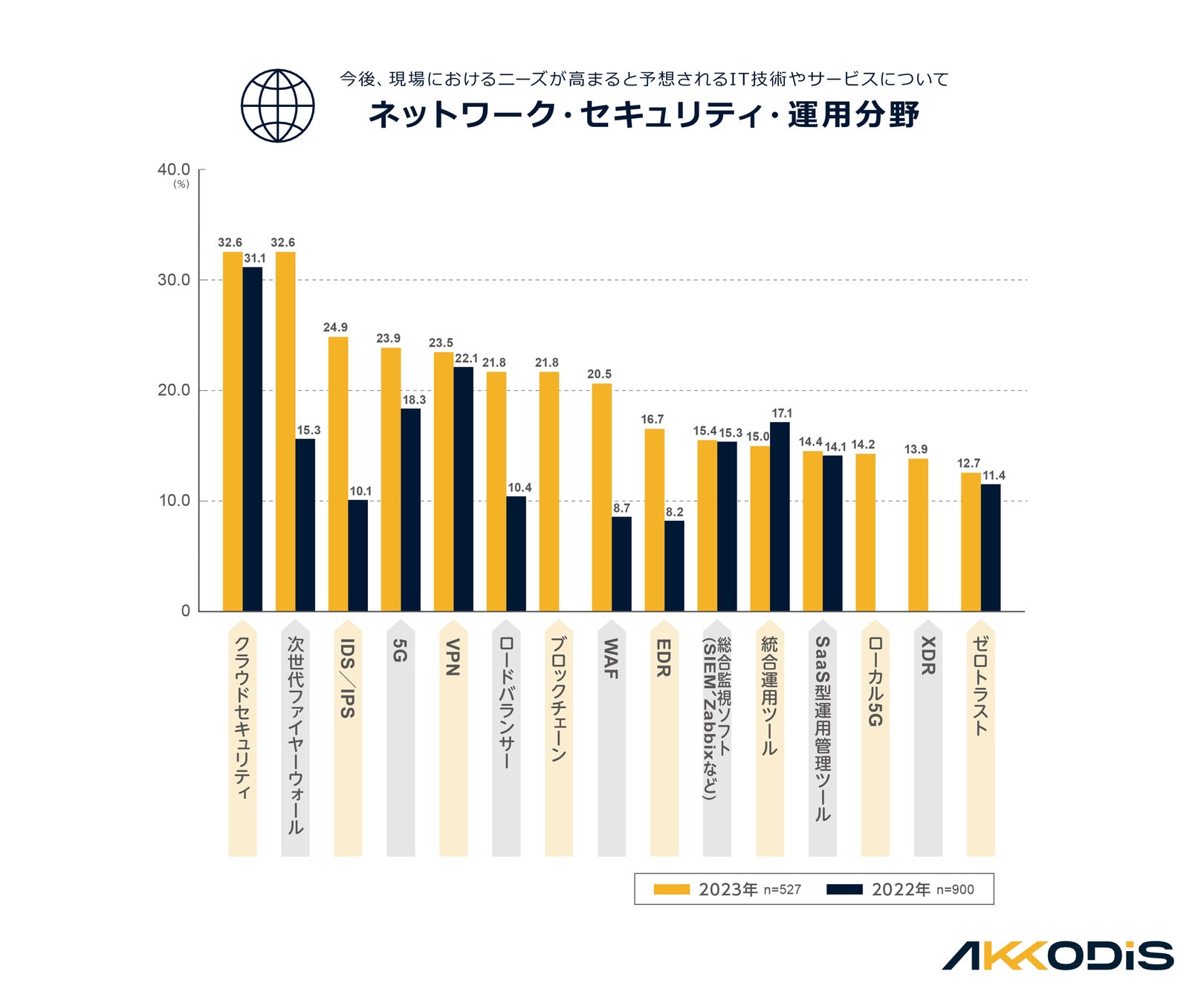 「ネットワーク・セキュリティ・運用」の分野で、今後ニーズが高まると回答したものは、1位「クラウドセキュリティ」、2位「次世代ファイヤーウォール」、3位「IDS/IPS」という結果になりました。昨年の調査と1位に変動はありませんでしたが、2位、3位は倍近い数値となり順位も大きく変動しています。近年の業務のクラウド化に伴い、大手企業から中小企業まで多くの企業が多様化するサイバー攻撃やセキュリティ事故により、被害金額が増加しています。セキュリティ対策は、企業にとって喫緊の課題となっており、そうした意識の高まりが反映された結果になりました。