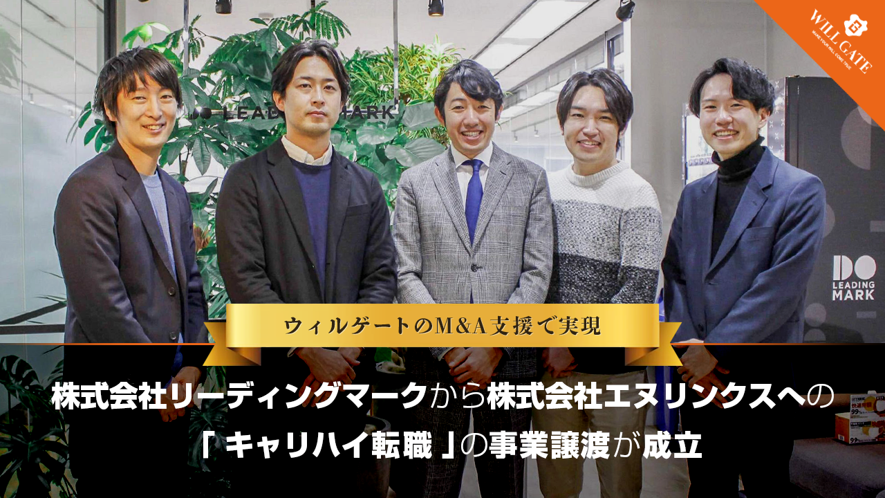 Web・IT領域のM&A仲介サービス「ウィルゲートM&A」( https://ma-gate.com/ )を提供する株式会社ウィルゲート(本社:東京都港区、代表取締役:小島 梨揮、以下 ウィルゲート)は、M&Aのアドバイザリーを担当した株式会社リーディングマーク(譲渡企業、以下、リーディングマーク)から、株式会社エヌリンクス(譲受企業、以下、エヌリンクス)への「キャリハイ転職」の事業譲渡が成立したことをお知らせします。また、事業譲渡が成立するまでのストーリーインタビューを公開しました。https://ma-gate.com/leadingmark_n-links/
