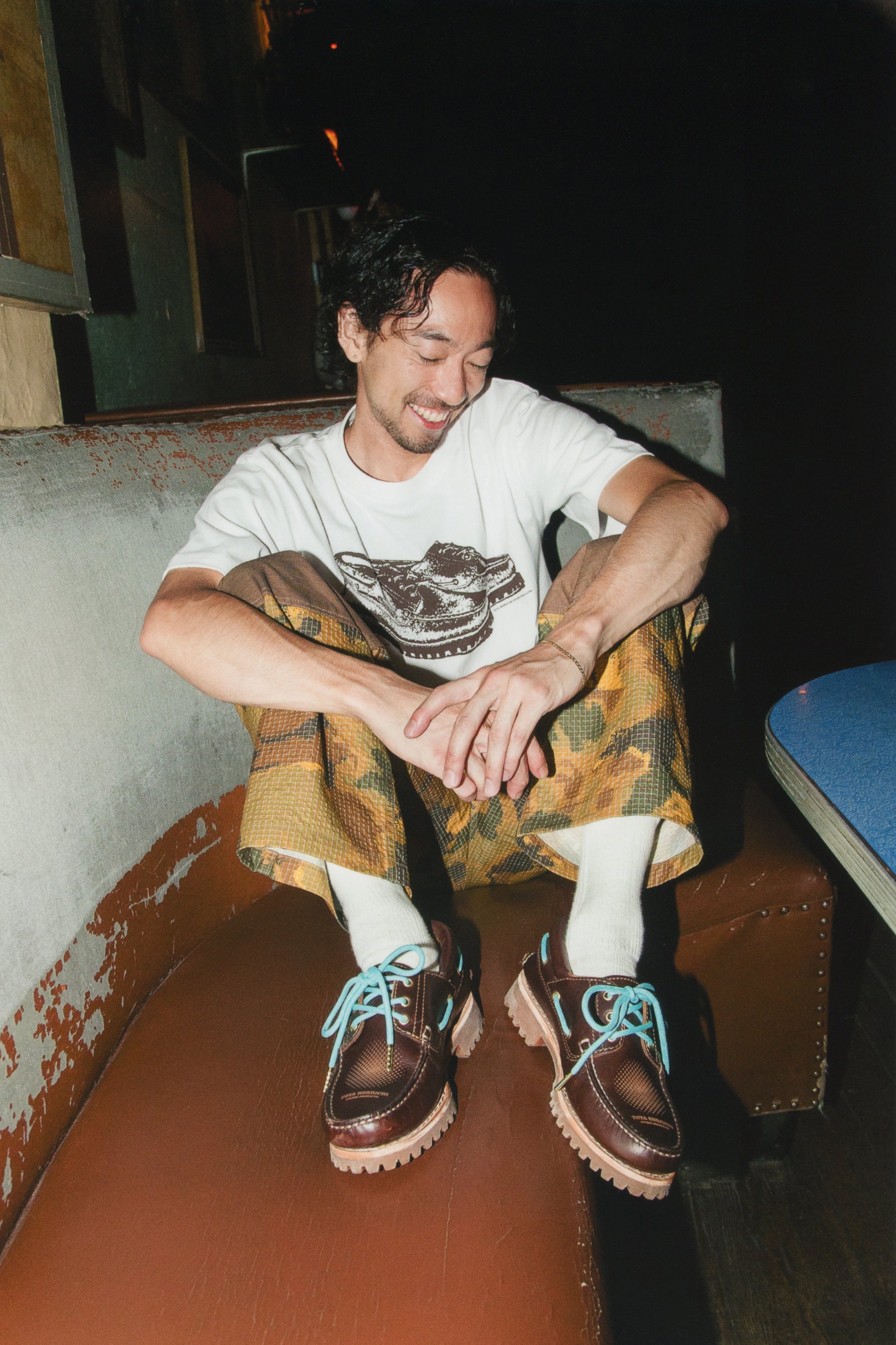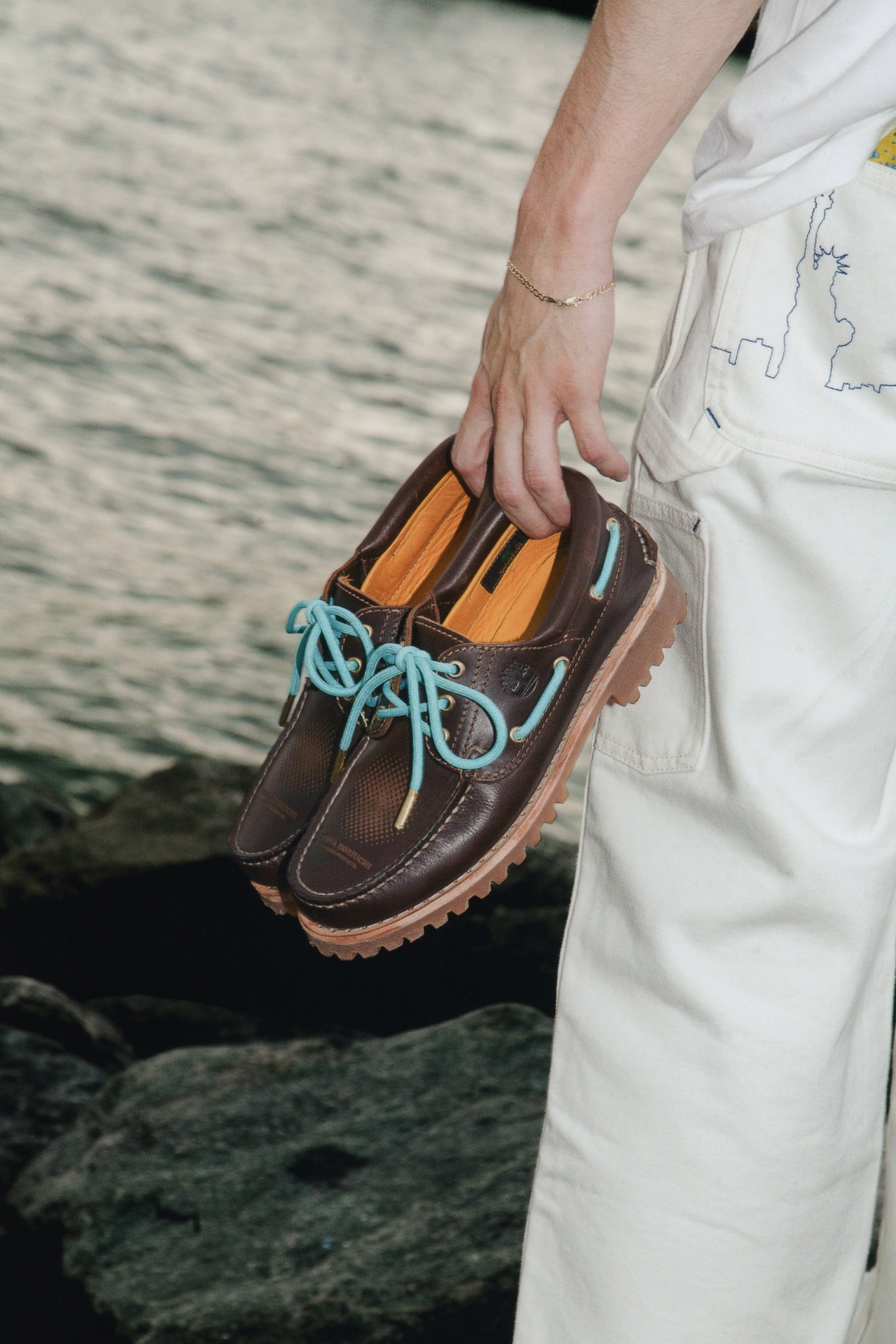 同氏との協業は今回が初となり、ティンバーランドを代表する「スリーアイ クラシック ラグ」のコラボレーションモデルと2型のTシャツを制作いたしました。「スリーアイ クラシック ラグ」は、定番のブラウンカラーをベースに、シルエットやアッパーのカラーはオリジナルに忠実でありながら、シューレースを同氏が拠点とするニューヨークのシンボルカラーの一つである鮮やかなブルーグリーンにアップデート。また、ゴールドのシューレースチップを新たにあしらうことでラグジュアリーの要素をプラスしたほか、甲部分には別注を示す“TOYA HORIUCHI STUDIO PRODUCTS®”のロゴを大胆に刻印しています。一方Tシャツは、どちらも 「スリーアイ クラシック ラグ」の別注モデルをグラフィックとして落とし込み、それぞれの前面と背面にティンバーランドのツリーロゴや“TOYA HORIUCHI STUDIO PRODUCTS®”のロゴをプリントしました。