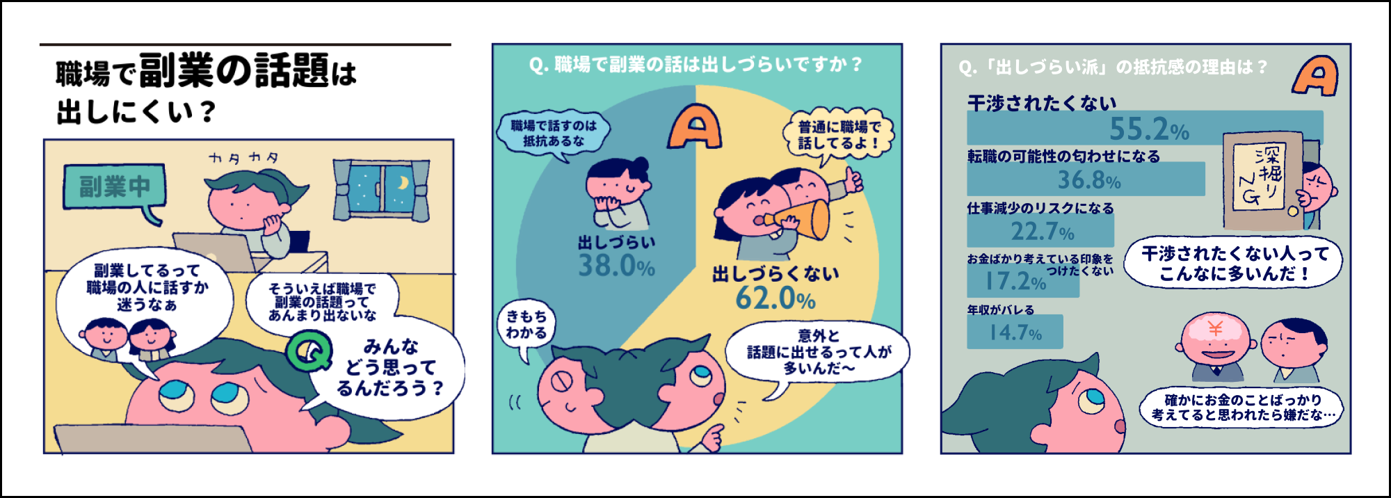 JobQ Townユーザへのアンケートで副業の話しを職場で出しにくいと回答したのは62.0%で、その理由として、「干渉されたくない」が55.2%、「転職の可能性を匂わせてしまうから」が36.8%、「仕事減少のリスクにつながる」が22.7%で上位3つの回答でした。副業には興味はあるものの、職場で副業を禁止されているため始められないといったコメントも多く見られました。