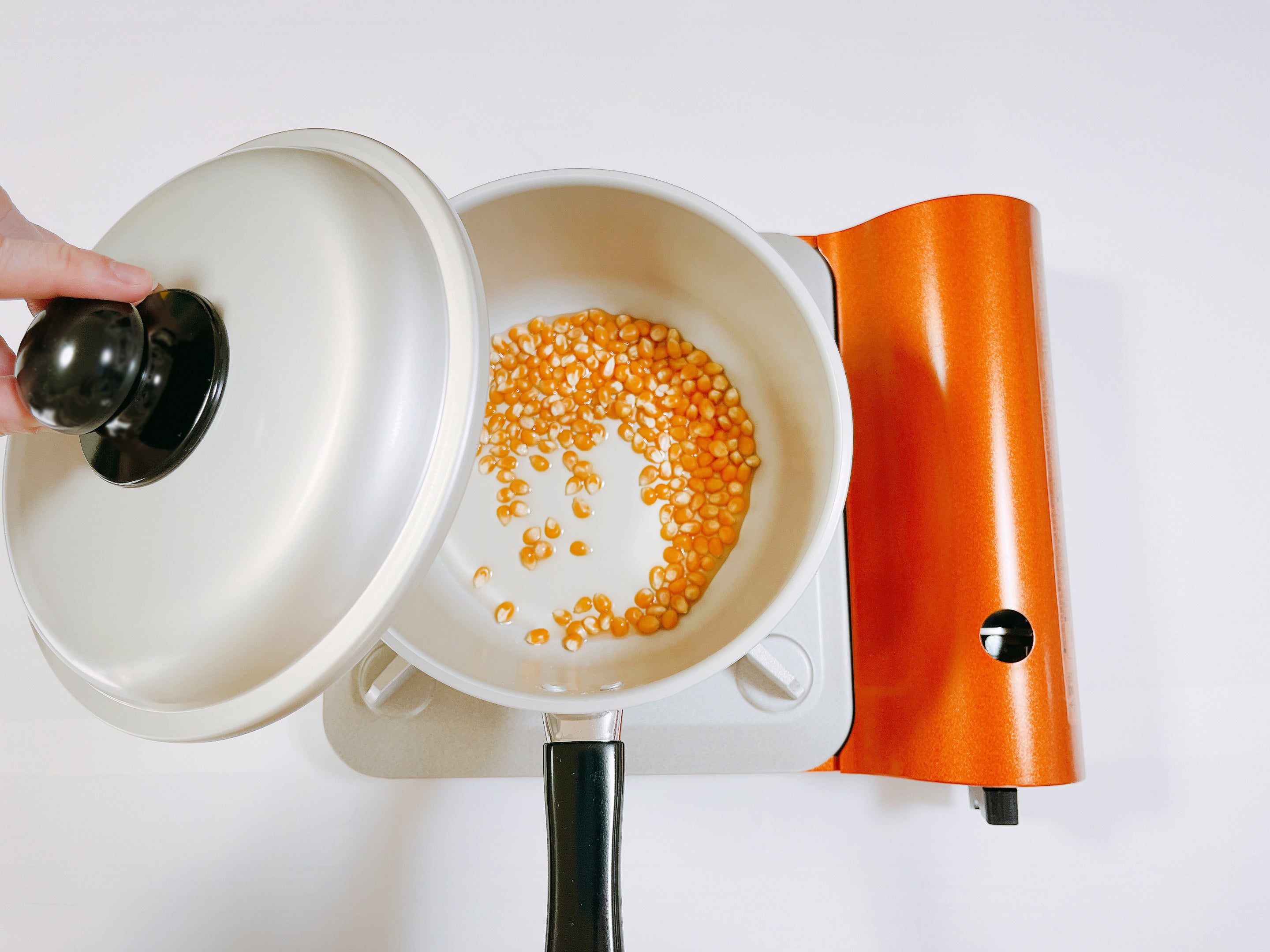 ②鍋にフタをして中火にかけ、ポンポンとはじける音がしたら、お鍋をゆすり続けます。