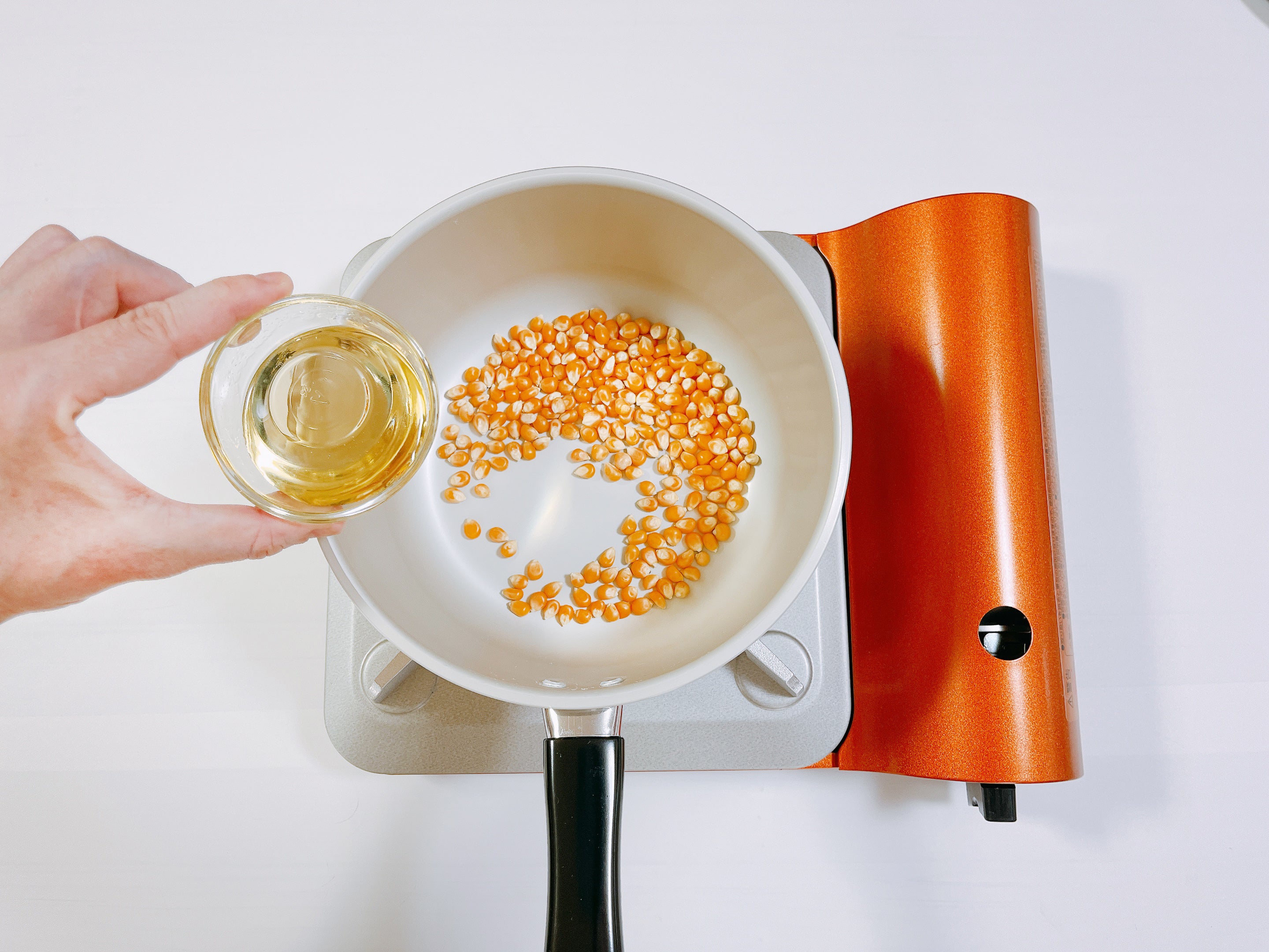 ①鍋に、マイクポップコーンの豆25gを入れて、サラダ油(大さじ1.5杯程度)を入れます。