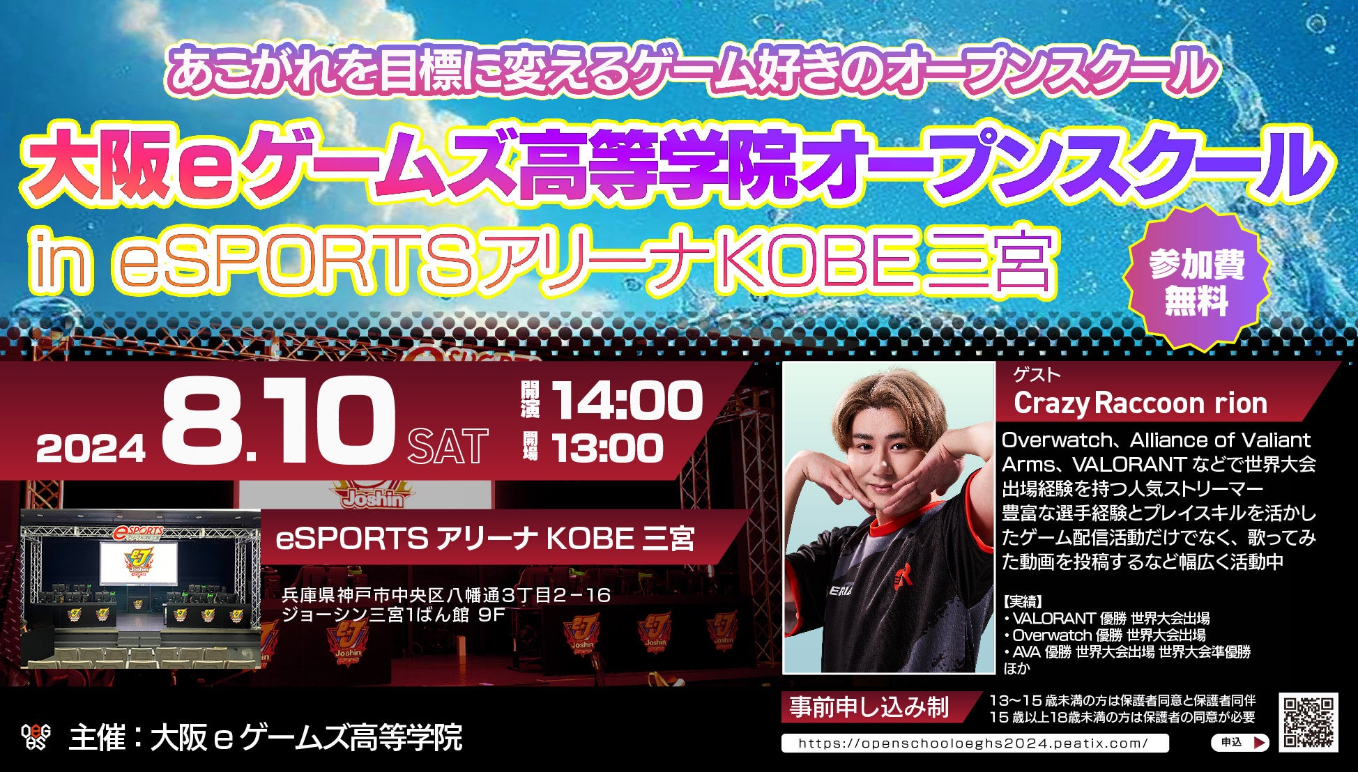「大阪eゲームズ高等学院 」(運営会社:株式会社アメージング 本社:大阪府浪速区、代表取締役:丸永克己)は同学院初の大型オープンスクールイベント「オープンスクール in eSPORTSアリーナKOBE三宮」開催します。
