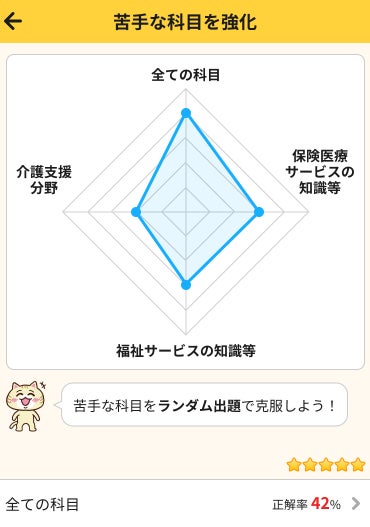 解いた問題の分野ごとの正解率を自動で集計し、レーダーチャートで視覚化。どの分野が得意で、どこに課題があるのかを一目で把握できます。 過去の実施回ごとの正解率や、苦手な傾向が出やすい問題に的を絞った復習も可能。試験直前期の総仕上げにも最適です。