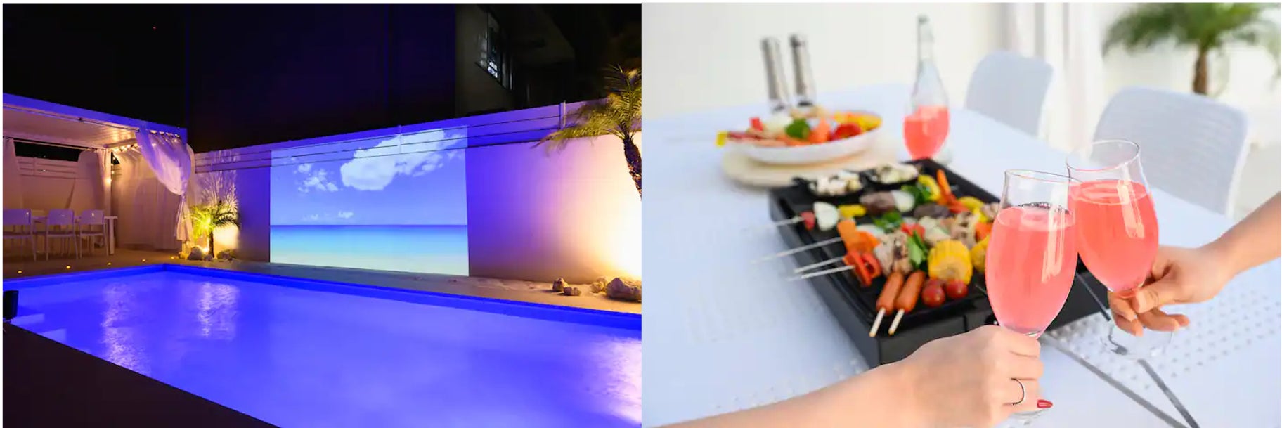 夜はライトアップされたナイトプールでリラックスし、プロジェクターでの映画鑑賞やくつろぎの時間を満喫できます。近隣にはコンビニやスーパーマーケットも充実しており、プールサイドでのBBQ、フルキッチンでのお料理などのお買い物も便利です。周辺には、葛西臨海水族館や日本最大級の大観覧車などが点在し、レンタル自転車を利用すれば、これらの観光スポットを便利に巡ることができます。