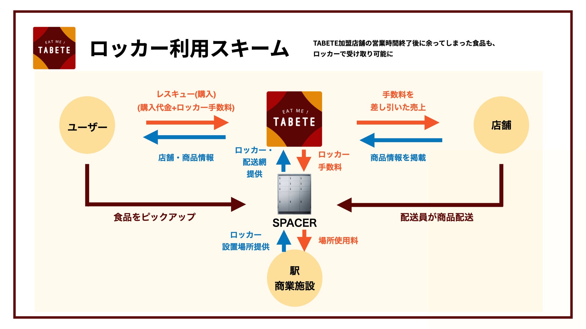 本事業は、スマートロッカー『SPACER』を使用して商品を受け取る仕組みを構築し、非対面でTABETEで決済した商品の受渡しを行います。