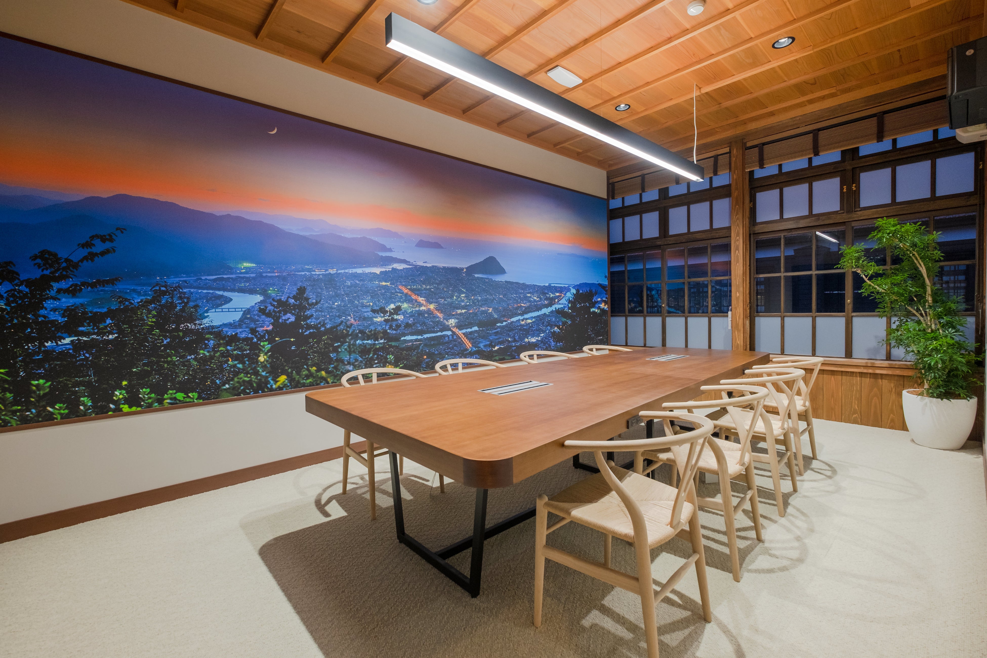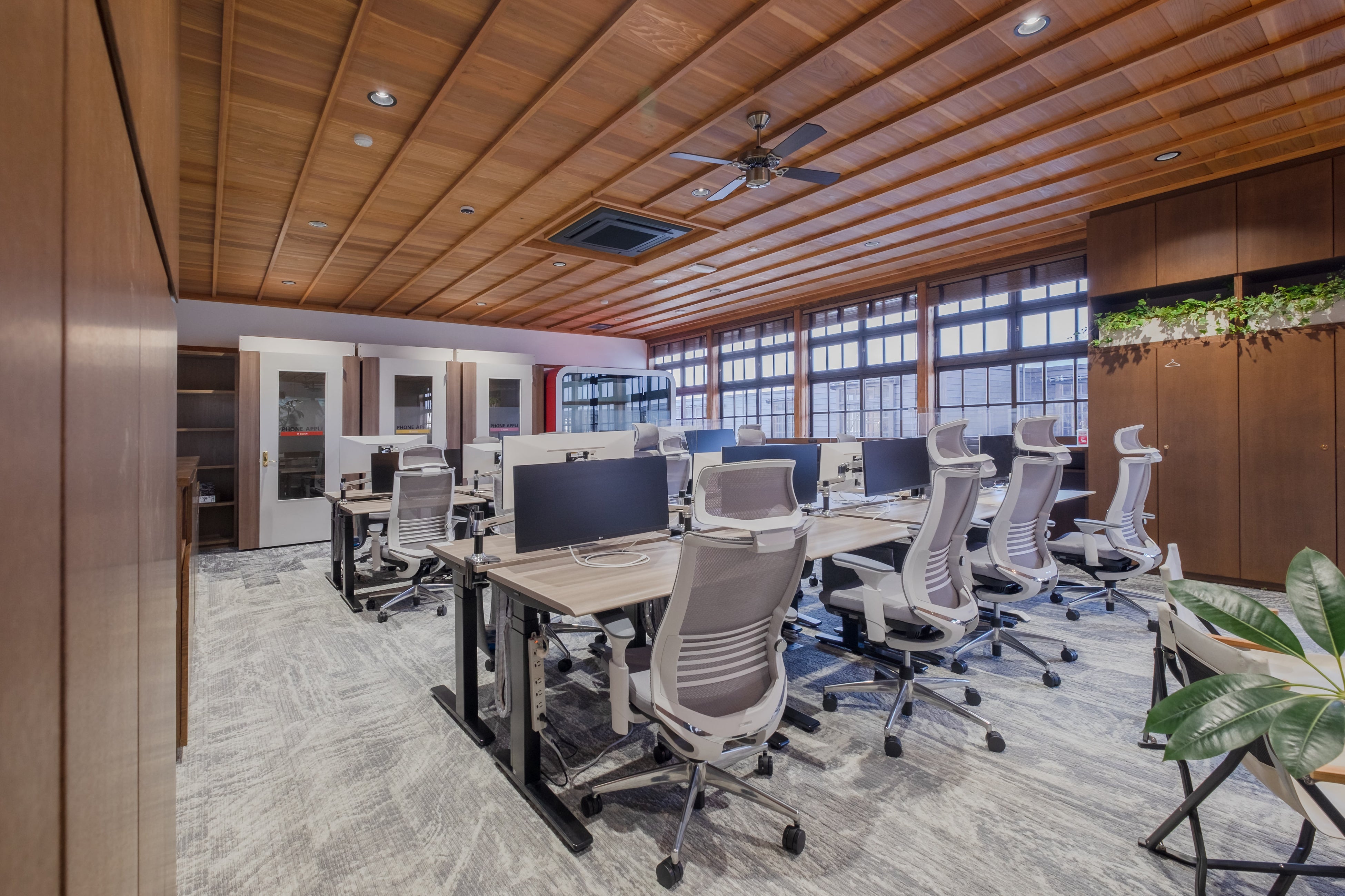 萩明倫館アプリ開発センターは、弊社のオフィスコンサルティングのノウハウを基に、テレワークとオフィスワークをシームレスに融合させた“ハイブリッドワークプレイス”として構築しました。東京本社同様に最新のIT機器を駆使し、オフィスは昇降デスクを用いたフリーアドレスで運用しています。本社とは映像でつながっており、大きなスクリーンを用いてリアルタイムの打ち合わせが可能です。また、個室ブース「Timely」や1on1ブースでは、周囲の音を気にせず、集中して作業や面談ができます。