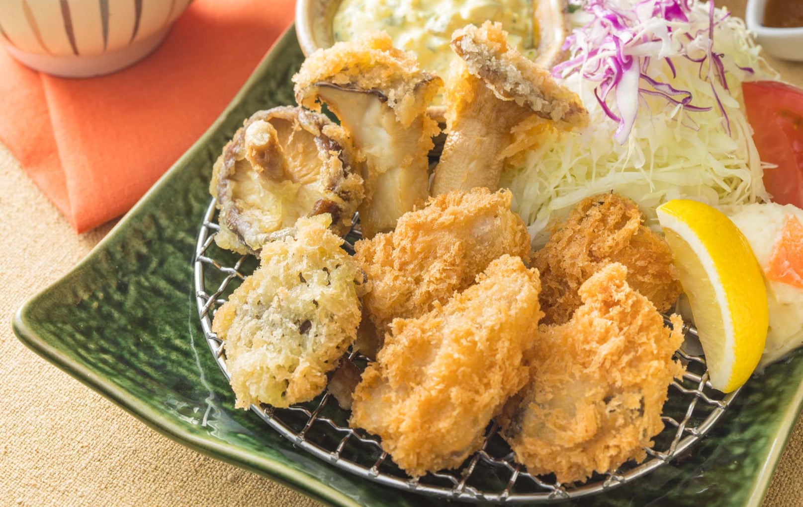 北海道産の脂ののった秋鮭とエリンギ、しいたけを大戸屋こだわりの生パン粉でサクッとフワッと軽やかに揚げました。店内仕込みの大葉入りタルタルソースとの相性は抜群。さっぱりと秋の味覚をお楽しみください。