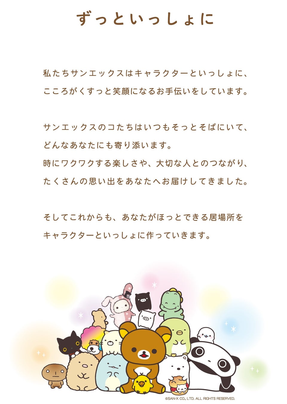 サンエックスは、これからもキャラクターと“ずっといっしょに”、こころがくすっと笑顔 になるお手伝いをし、ほっとできる居場所を作っていきます。
