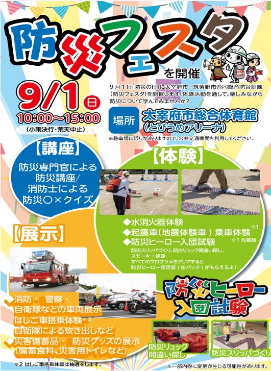 9/1に開催される「太宰府市・筑紫野市合同総合防災訓練(防災フェスタ)」の一環として実施。