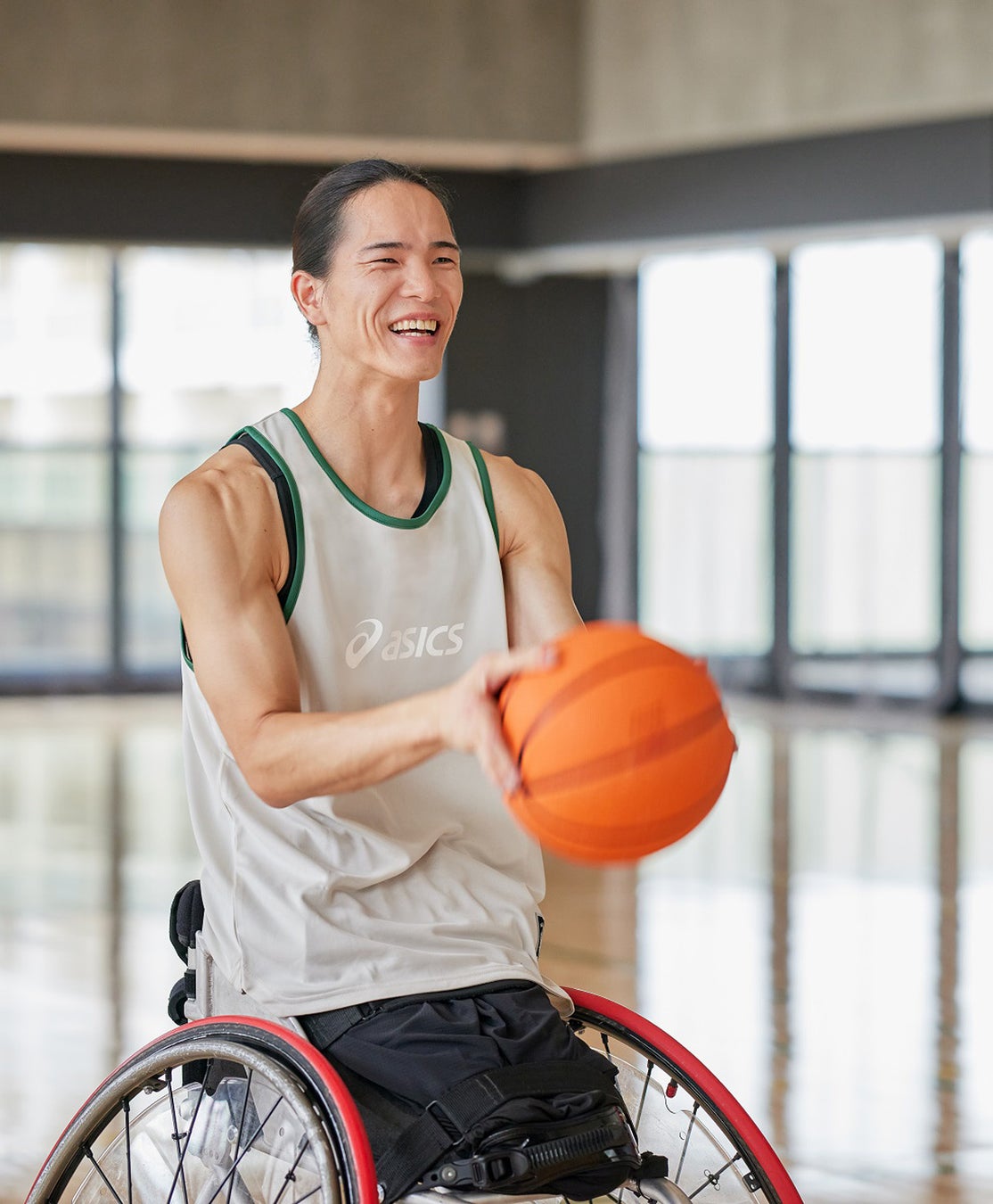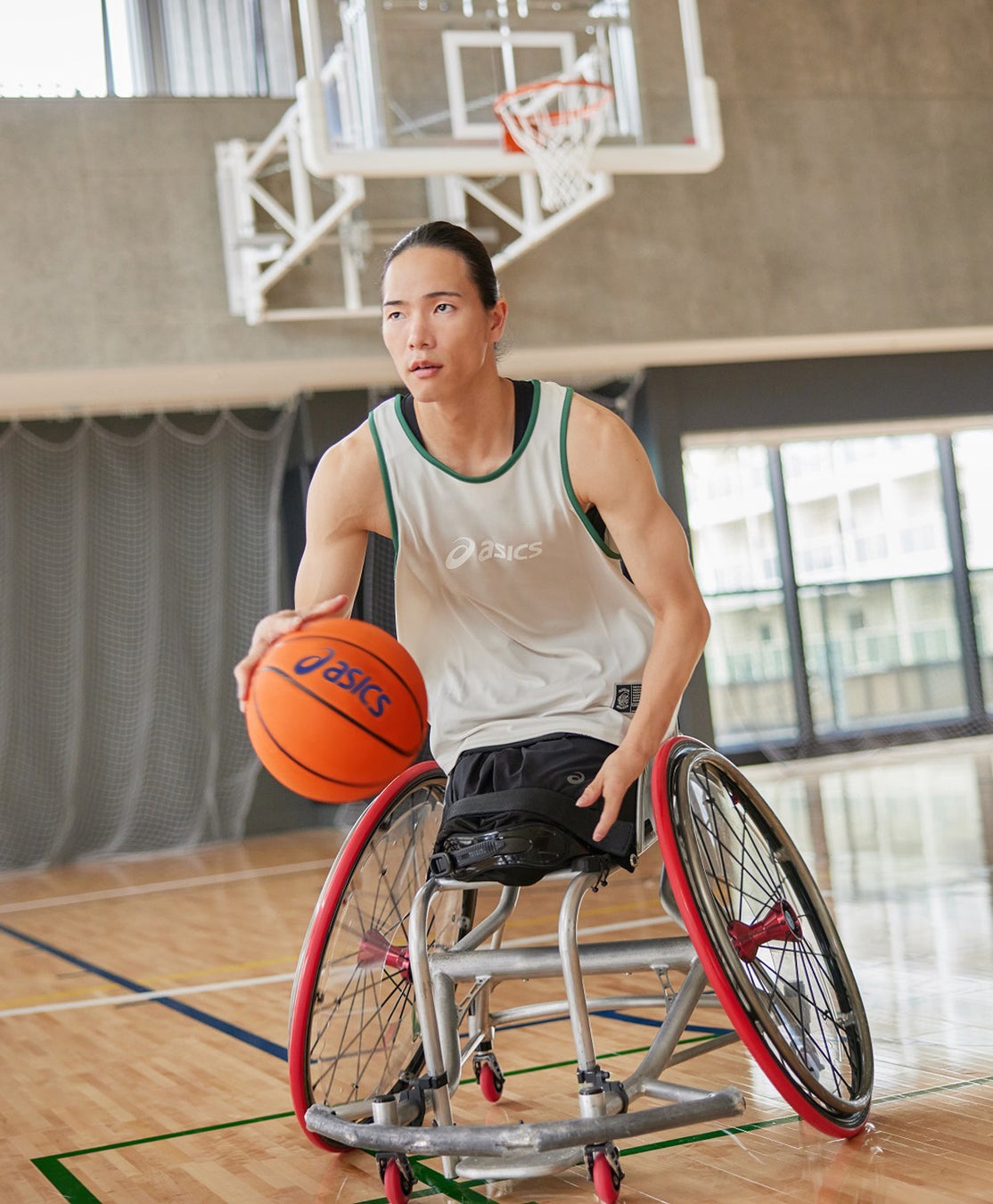 アシックスの鳥海連志です。アシックスの一員となれたことを大変うれしく思っています。プロ車いすバスケットボールプレーヤーへの転向は競技に集中できる環境をつくるだけでなく、自身にプレッシャーをかける意味もあり、このプレッシャーこそがモチベーションの源泉とも言えます。プロとして活動していくにあたり、アシックスとともに歩んでいけることはとても心強いです。今後はアシックス所属アスリートとして、多様な考えや価値観を身につけ、車いすバスケットボール界や社会に還元していきたいと思います。