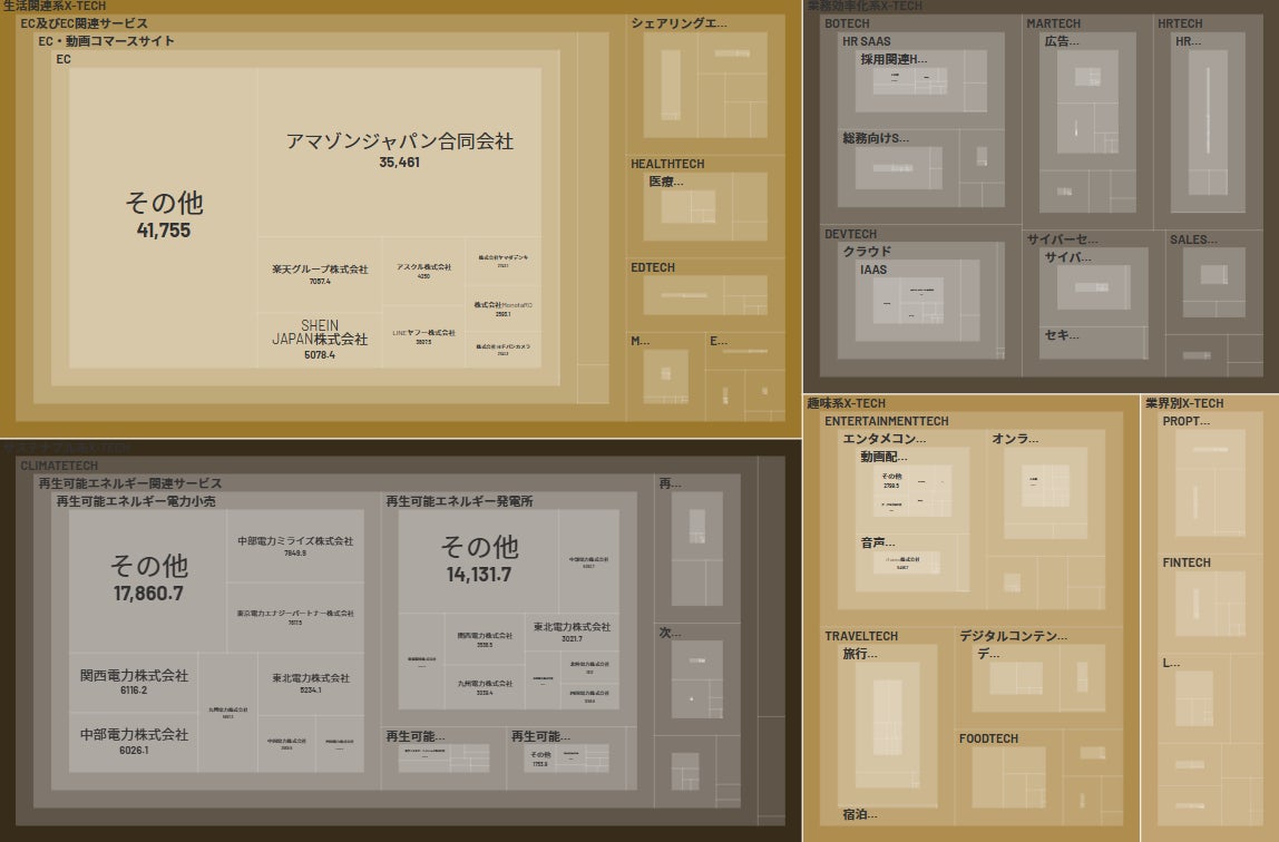 こうした市場環境を踏まえ、当社は業界関係者の投資判断や事業戦略立案をより効果的に支援するため、独自のAI分析と市場調査に基づき、国内X-Tech企業を516の産業×技術分野で体系化したカオスマップを新たに作成し、公開いたしました。