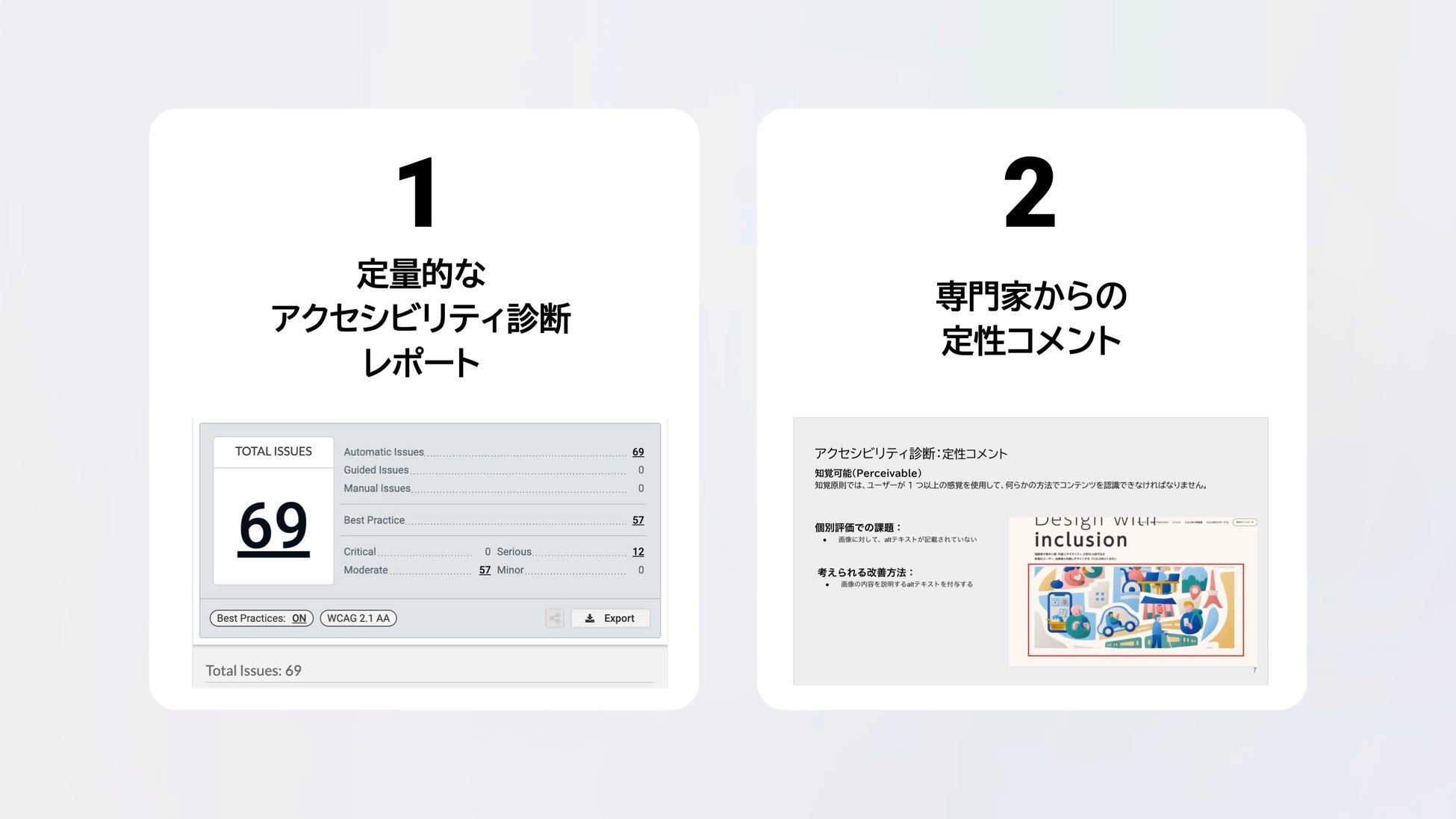 定量的なアクセシビリティ診断レポートと、専門家からの定性コメントによって、どの程度アクセシブルなウェブサイトとなっているか診断いたします。