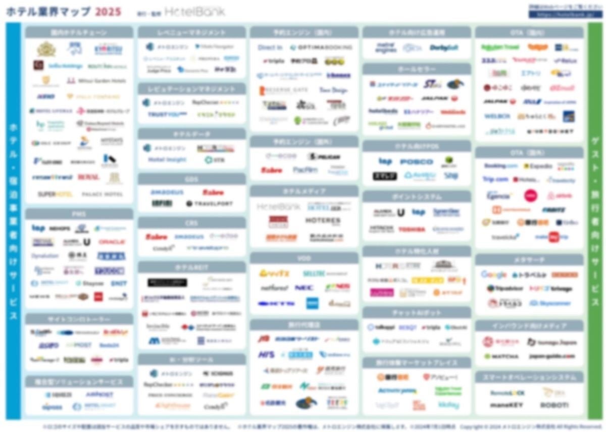 宿泊施設向けレベニューマネジメントツール『メトロエンジン』を提供し、宿泊業界のDX化や集客支援を行うメトロエンジン株式会社(本社:東京都品川区、代表取締役CEO:田中良介、以下メトロエンジン)は、毎年大好評いただいているホテル業界マップの最新版「ホテル業界マップ 2025」を作成し、運営するホテル特化型メディア「HotelBank(ホテルバンク)https://hotelbank.jp」にて無料で公開いたします。宿泊・観光業界のトレンドに合わせ、新たなカテゴリも追加し、マッピングを刷新いたしました。