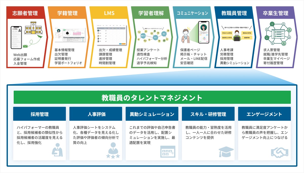 教育データの見える化から志願者、成績、学習履歴、出欠席、授業評価など、教育機関に必要な情報を管理する機能をワンプラットフォームに集約する「ヨリソル」は、教育現場で散在するデータの活用にとどまらず、教職員の働き方改革を実現するため、タレントマネジメント機能を強化しました。