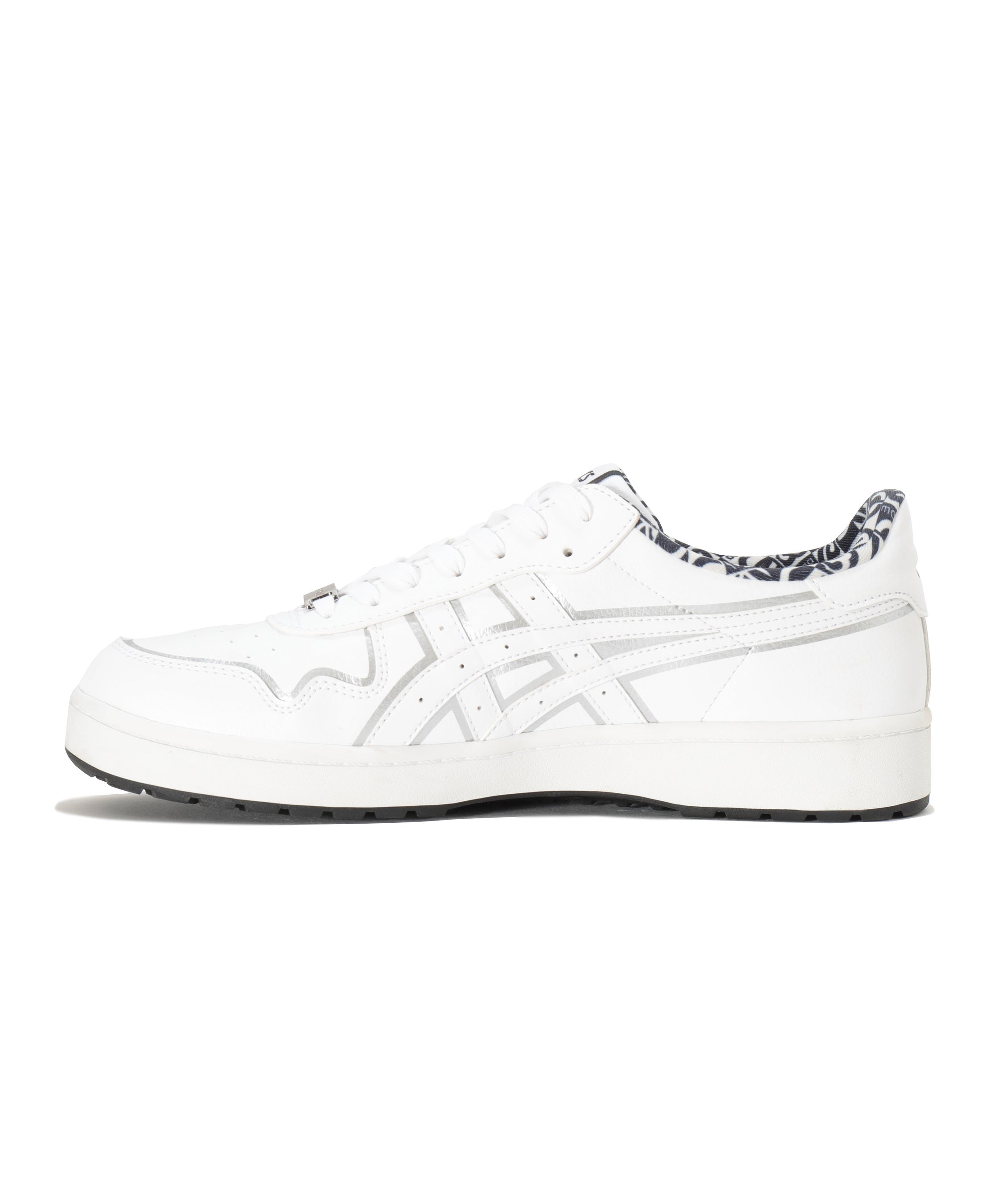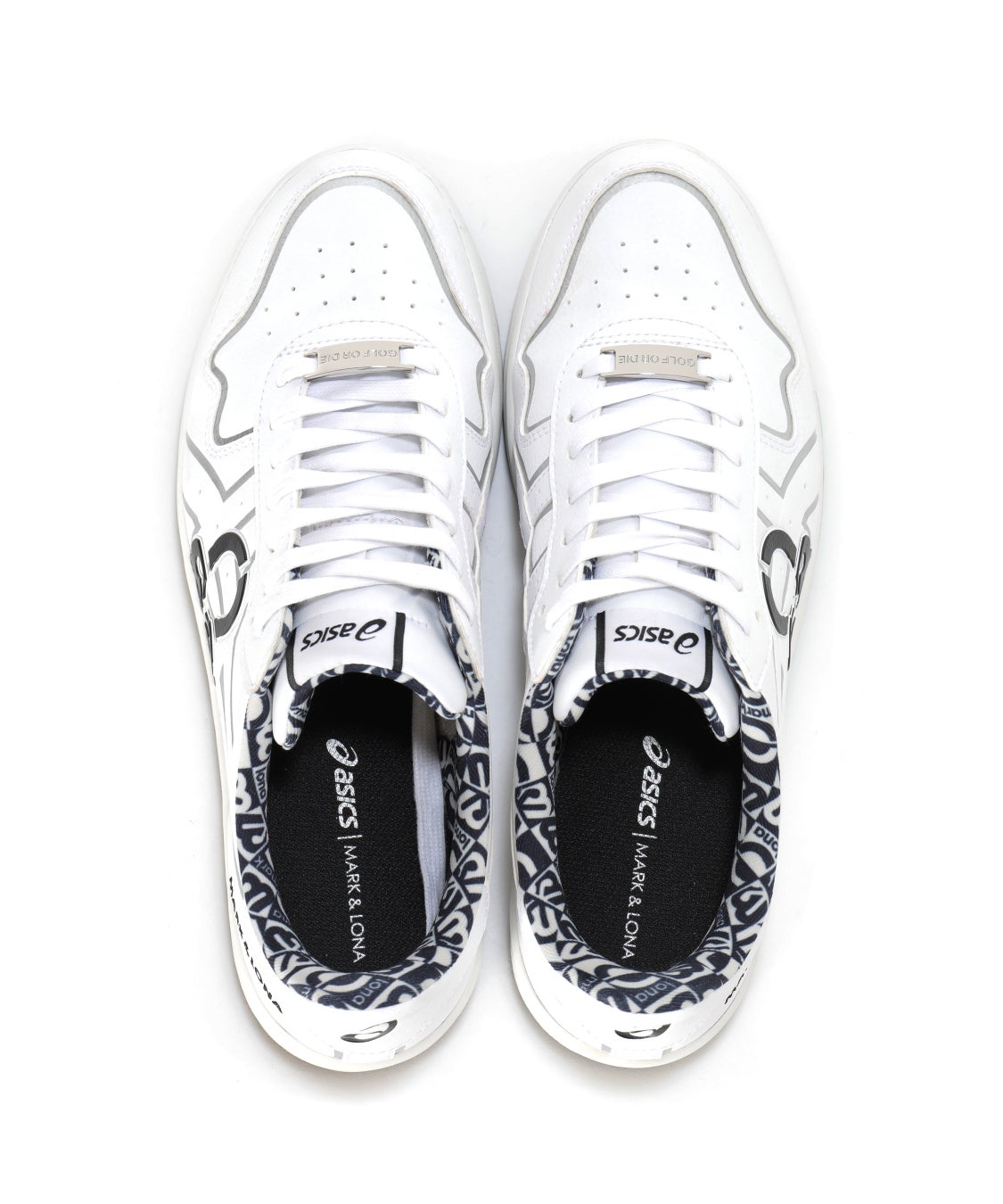 デザイン面では、象徴的な「アシックスストライプ」の上に、今季から展開する新たなアイコンとなる”エレメントスカル”を配置。シンプルなホワイトのボディにシルバーのトリムが控えめな光沢を添え、上質な存在感を放ちます。さらに、シューズの中敷にもオリジナルの総柄プリントを施しており、細部に至るまでブランドの世界観を表現した贅沢な仕上がりとなっています。機能性においても、アッパーの人工皮革に加え、シューズ内側のライニングにも撥水加工を施すことで、朝露や急な天候の変化にも対応する全天候型の仕様を実現しました。(※完全防水ではありません)さらに、ゴルフ専用に設計された靴底がスイング時の安定感と優れたグリップ力を発揮し、高いクッション性が長時間のラウンドでも快適な歩行をサポートします。また、スタイルに合わせて選べる2本のシューレースを同梱。本体と一体感のある同色のシューレース、コントラストで足元を引き締めるブラックのシューレースが付属しています。その日の気分やコーディネートに合わせた自由なカスタマイズを楽しみながら、ファッション性とパフォーマンスを両立した快適なプレーをお楽しみいただけます。