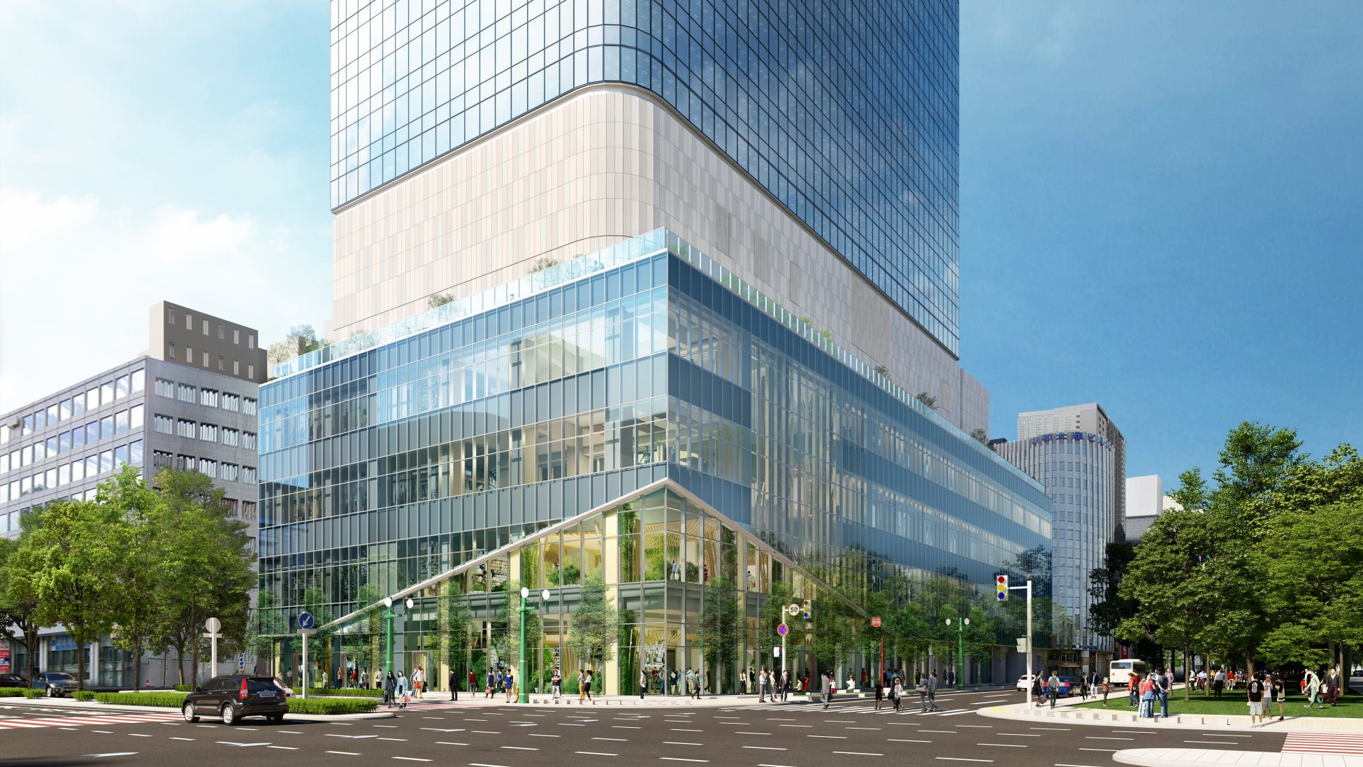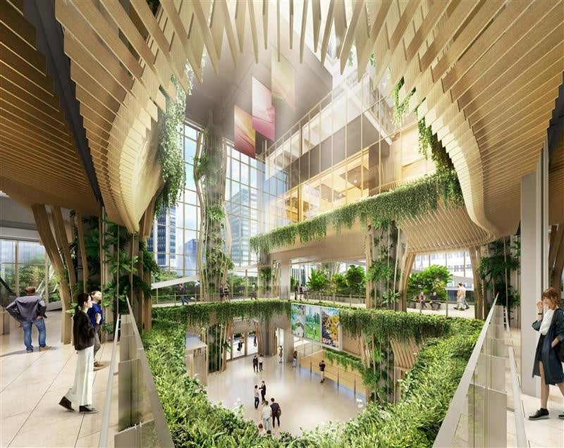本物件では、認定の条件である「ZEB Oriented」認証(事務所用途部分)の取得、「再生可能エネルギー100%電力※1の導入」を予定しており、また建物の省エネ化や熱エネルギーの面利用(地域冷暖房施設の整備・利用)などによる脱炭素に向けた取り組み、並びに免振工法の採用による建物の耐震性確保や帰宅困難者対応などによる強靭化に向けた取り組みが高く評価され、この度、認定を取得いたしました。