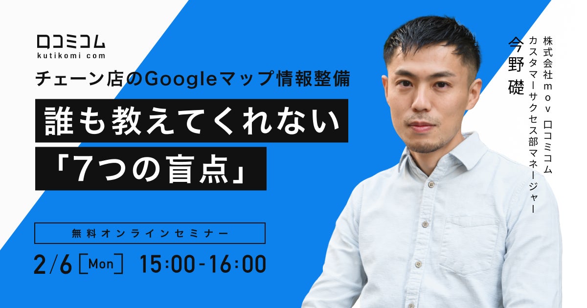 口コミサイトを”もっと”売上に変える店舗支援SaaS「口コミコム」を運営する株式会社mov(代表取締役:渡邊 誠、本社:東京都渋谷区、以下mov)は、「チェーン店のGoogleマップ情報整備 誰も教えてくれない『7つの盲点』」セミナーを開催いたします。