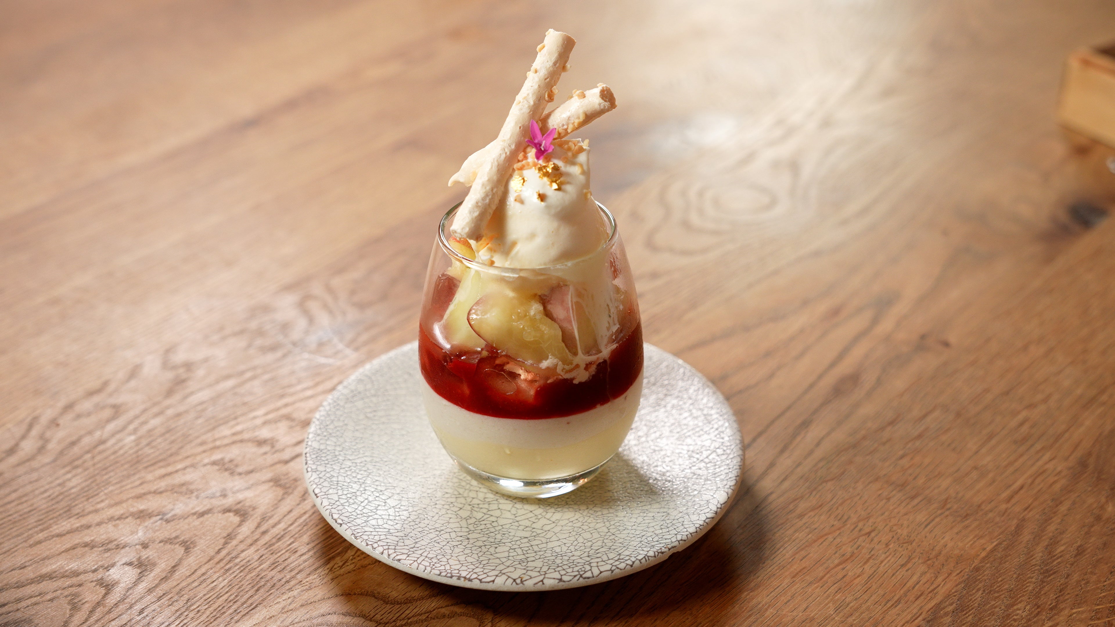 (1)「山梨県産 桃とワインのピーチメルバ風パフェ」