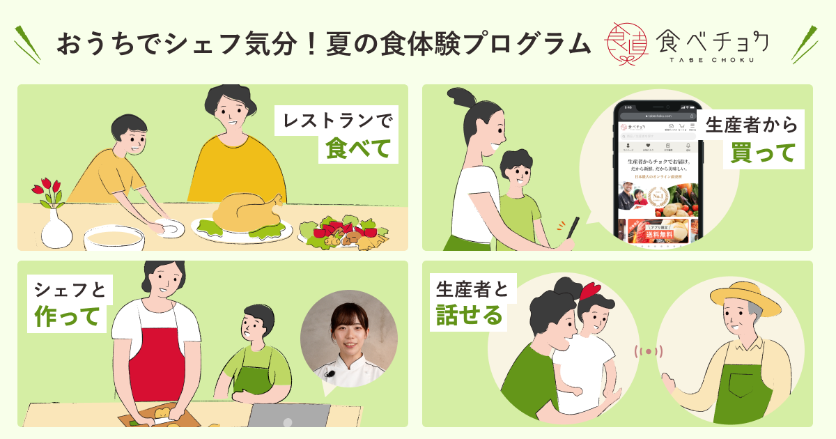「おうちでシェフ気分!夏の食体験プログラム」は、食べチョク生産者さんの食材を使った料理をお店で食べ、食べチョクで食材を購入し、オンライン料理教室でシェフと一緒に料理を作れるプログラムです。料理教室は、食材を購入すればスマホやPCから無料で参加できます。夏休みにご家族でもお得に楽しんでいただけます。