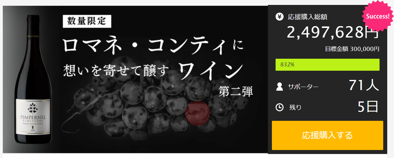 挙式・披露宴の企画・運営を主たる事業として展開する株式会社エスクリ(本社:東京都中央区、代表取締役社長CEO:渋谷守浩、東証プライム:証券コード 2196 以下、エスクリ)が運営するワインショップ「WINELIST」では、2023年1月28日よりアタラシイものや体験の応援購入サービス「Makuake」にて日本初入荷となるワインの先行販売を開始し、2月14日現在の応援購入総額が2,497,628円、832%達成したことをご報告いたします。2月19日(日)まで販売予定です。「オーストラリアのロマネ・コンティ」とも言われる「ピンパネルヴィンヤーズ」のワインをこの機会にぜひお楽しみください。
