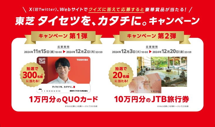 今回の「東芝 タイセツを、カタチに。 キャンペーン」は、公式キャンペーンサイトまたは公式Xアカウントからどなたでも応募できるキャンペーンです。応募方法は第1弾・第2弾それぞれに出題されるクイズに回答するだけ。気軽に楽しみながら応募できます。第1弾は抽選で300名様に反町隆史オリジナルQUOカード1万円分が、第2弾は抽選で20名様にJTB旅行券10万円分が当たります。
