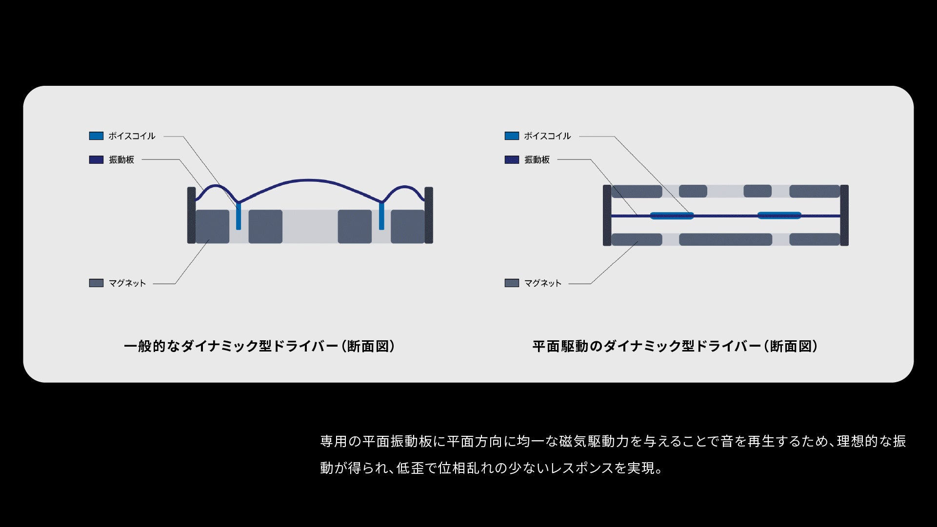 10㎜径ダイナミック型1基による重厚でリアルな低域、6㎜径平面磁気駆動型1基による低歪みで伸びやかな中高域、バランスドアーマチュア型3基による高感度で高いダイナミックレンジを誇る高域。3種のドライバーが相互に補完をするように、各ドライバーの特性を妥協なく突き詰めました。