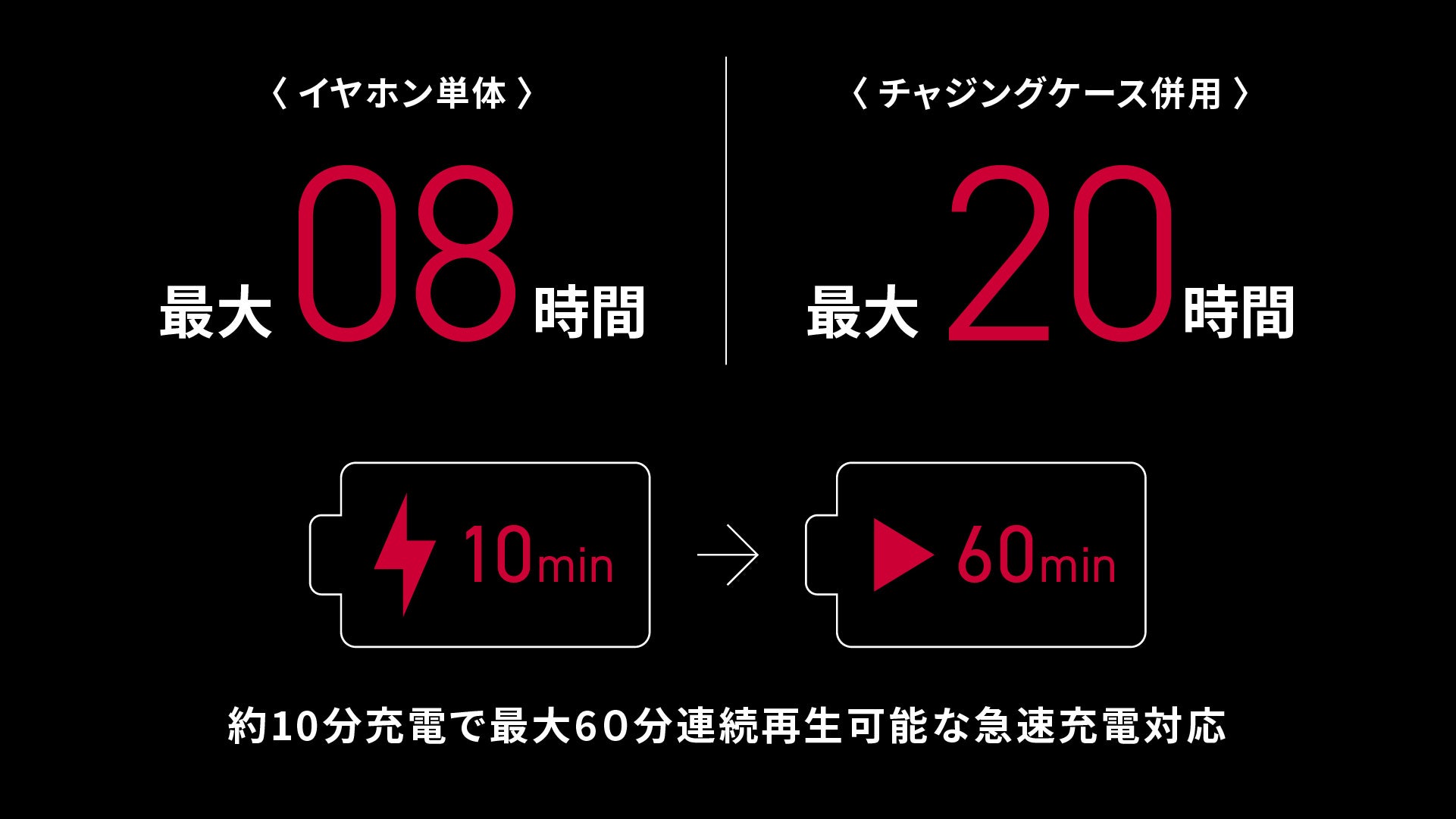 イヤホン単体で最大8時間(*3)、チャージングケース併用で最大20時間*3の長時間再生が可能。バッテリーを気にせずお使いいただける、安心のロングライフバッテリーです。