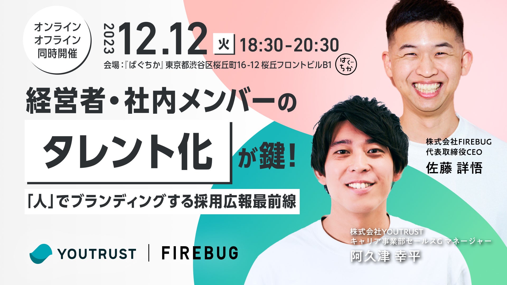 VUCA時代の到来により、企業のさまざまな活動に変化が求められてきています。これら変化に応じて人的資本経営が現在注目されてきており、採用・広報、企業ブランディングにおいても「人」を軸とした取り組み・サービスが増えてきています。本セミナーでは「従業員のタレント化」をテーマに、身近な人との繋がりを活かせるキャリアSNS「YOUTRUST」を提供する株式会社YOUTRUSTの阿久津幸平氏と、”タレント力”を軸にアーティスト・芸能人に留まらず、経営者や事業責任者等のタレント力拡張をサポートするサービスを展開する当社代表の佐藤詳悟が、企業の「人」を活かした採用・広報活動のトレンドや具体的事例について解説・ディスカッションします。