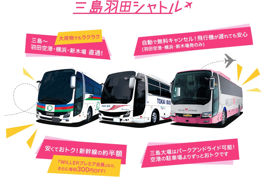 ① インターネット予約:予約サイト「WILLER TRAVEL」(https://travel.willer.co.jp/bus/airport-bus/mishima-haneda/)