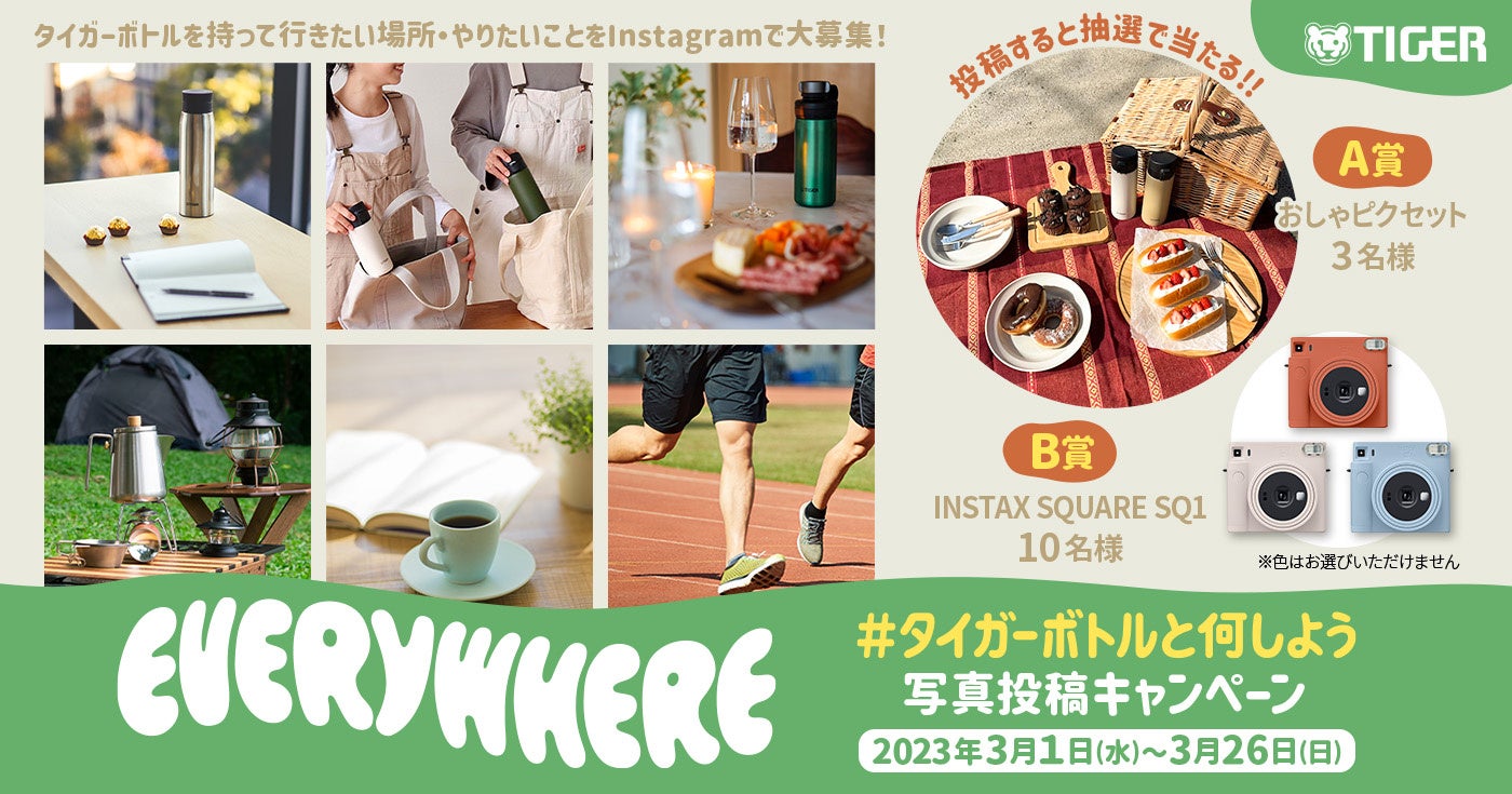 当社は2023年1月に、自由な発想でどこにでもタイガーボトルを持って行って使ってほしいという想いを込めたボトルの新しいコミュニケーションコピー「EVERYWHERE」を公開しました。本キャンペーンでは、「#タイガーボトルと何しよう」の呼びかけのもと、Instagramで皆様からのタイガーボトルを持っていきたい場所・やりたいことの投稿を募集します。投稿いただいた方の中から抽選で3名様に、Instagramで話題の、フォトジェニックなお弁当やスイーツ、食器などを持ち寄って楽しむピクニック「おしゃピク」や、自身の“推し”グッズと共にピクニックを楽しむ「推しピク」がすぐにできる、ピクニックセットをプレゼント。ぜひ暖かくなるこれからの時期に、タイガーボトルを連れて、「EVERYWHERE」でピクニックを楽しんでください。