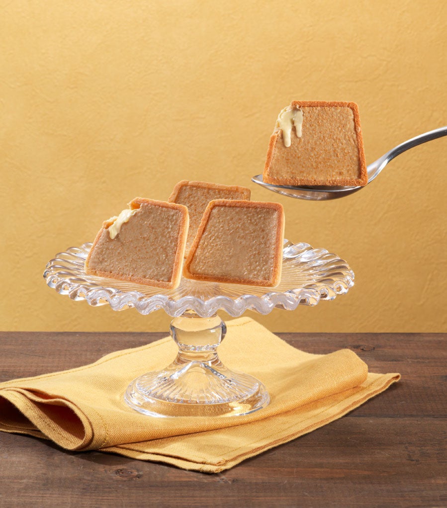香ばしく焼いたかわいらしいプリン型のタルト生地に、トロリとしたプリンチョコを絞り、さらにキャラメルチョコ、 表面にキャラメルパウダーをトッピングし焼き上げています。サクサク食感のタルト、とろけるチョコクリームは相性抜群!くせになる美味しさです。