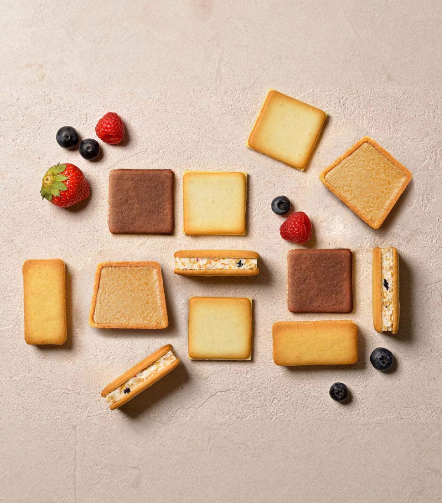 兵庫県産牛乳を使った豊かな風味のクッキー生地はサクサクとした食感が楽しめます。そのクッキーでホワイトチョコレートをサンドし、一つで満足感たっぷりです。冷蔵庫で冷やしてお召し上がりいただくとパキッとした食感が生まれ、また違った美味しさです。