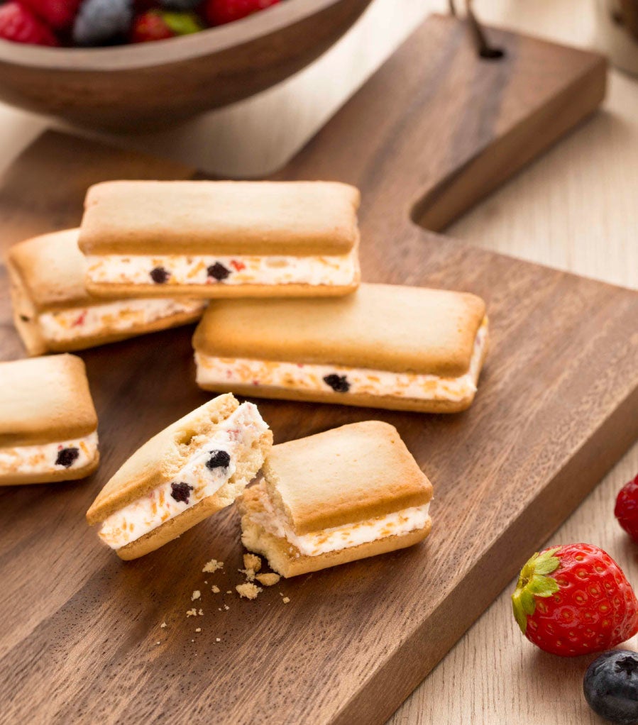 ヨーグルト風味のチョコの中にストロベリー・ラズベリー・ブルーベリーの3種のベリーとコーンフレークを入れて兵庫県産牛乳と小麦全粒粉をブレンドしたクッキーでサンドしました。ザクザクとした食感やヨーグルトの風味がお子様にも人気です。
